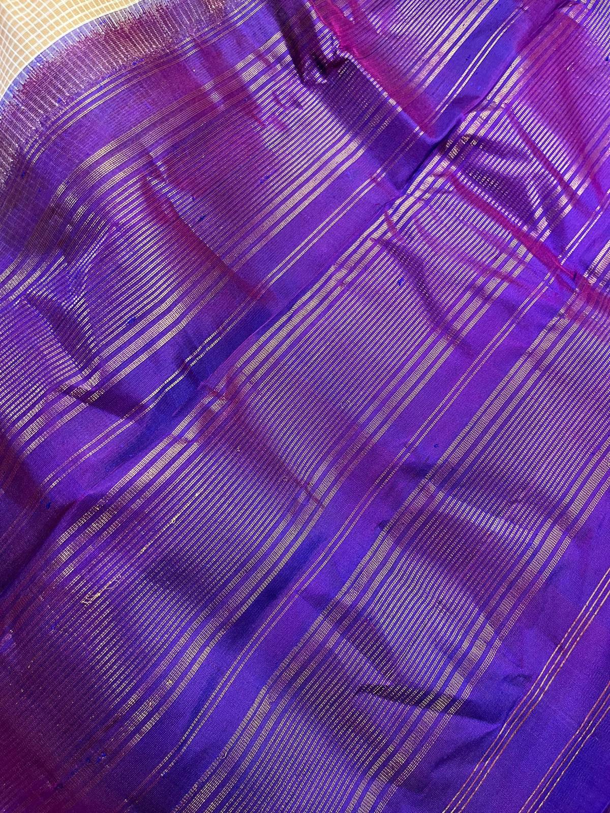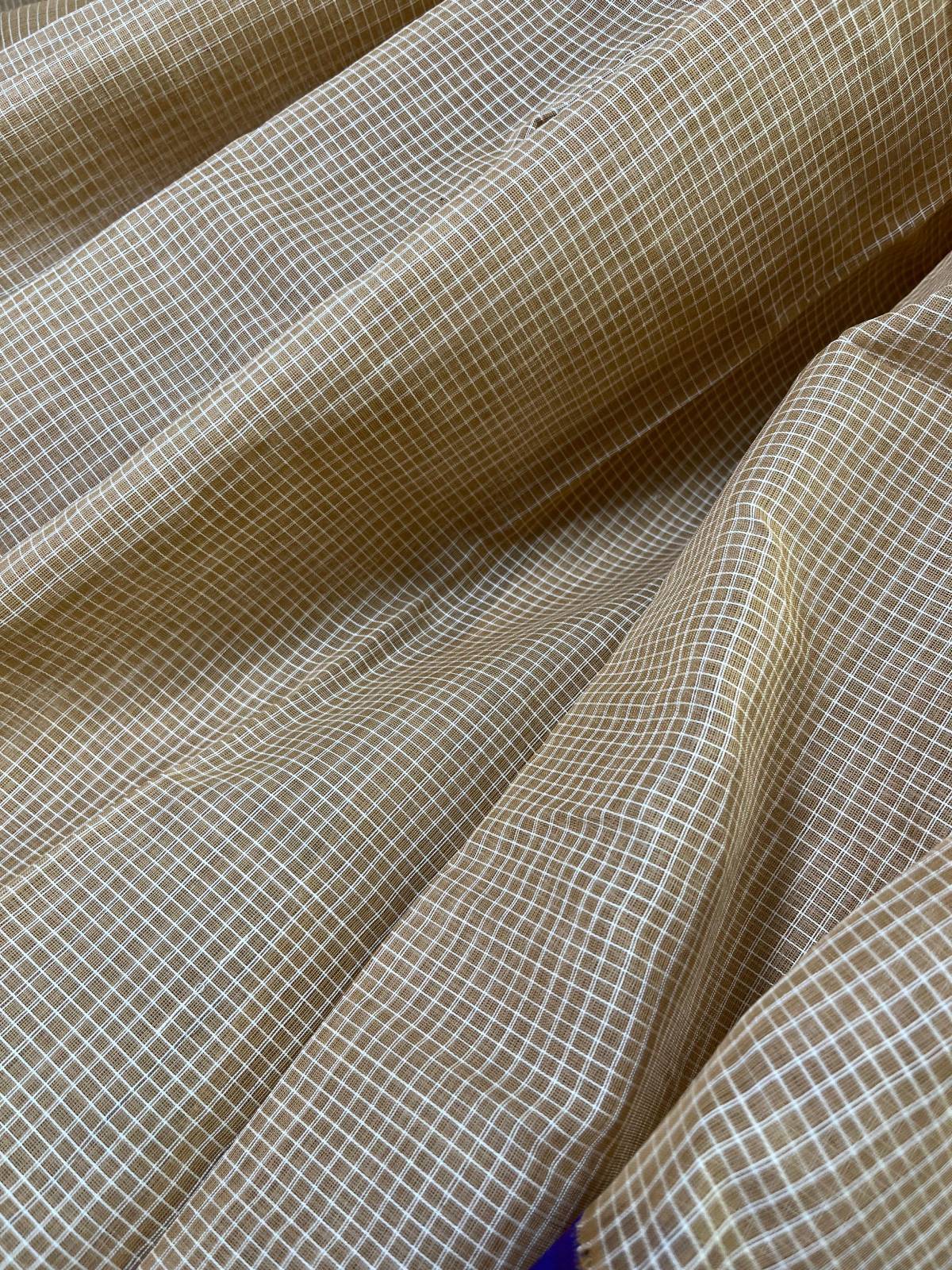 A soothing beige cotton pure handloom Gadwal saree crafted with elegant all-over checks that lend a timeless appeal. The saree is beautifully highlighted with a contrasting purple border and an intricately woven palla that reflects the finesse of traditional Gadwal artistry. Lightweight, graceful, and versatile, this saree comes with a matching running blouse piece, making it perfect for any elegant occasion.