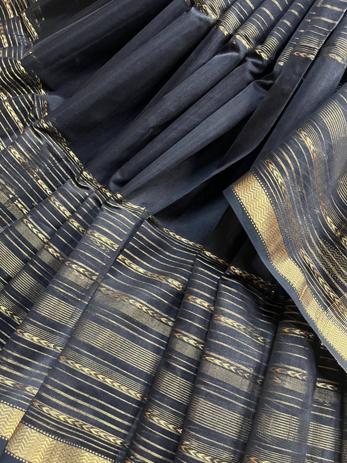 black sico pure handloom Maheshwari saree, featuring all-over gold horizontal stripes that add a subtle shimmer to its rich texture. The saree is complemented by an intricately woven palla, showcasing the finesse of traditional craftsmanship. Finished with a matching running blouse piece, this timeless drape blends grace, comfort, and classic Maheshwari elegance—perfect for festive and special occasions.