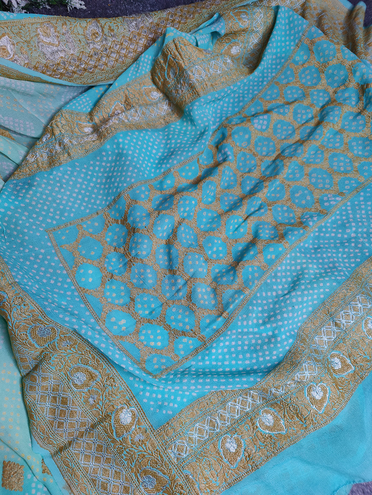 BLUE SHADED GEORGETTE PURE HANDLOOM RAI BHANDEJ WITH ALL OVER GOLD BUTTA WITH SILVER GOLD BORDER AND GOLD JAAL PALLA