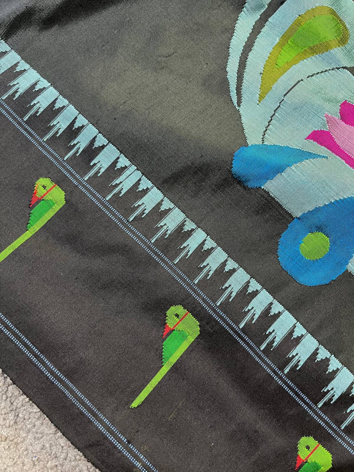 A captivating blue silk pure handloom Paithani saree, crafted with a serene all-over plain body that highlights its luxurious sheen. The saree is beautifully framed with a black intricate muniya border, adding a bold and traditional contrast. Its black intricate peacock palla stands out with exquisite detailing, celebrating the rich legacy of Paithani artistry. Finished with a matching running blouse piece, this saree is a perfect choice for graceful festive wear, weddings, and timeless traditional elegance.