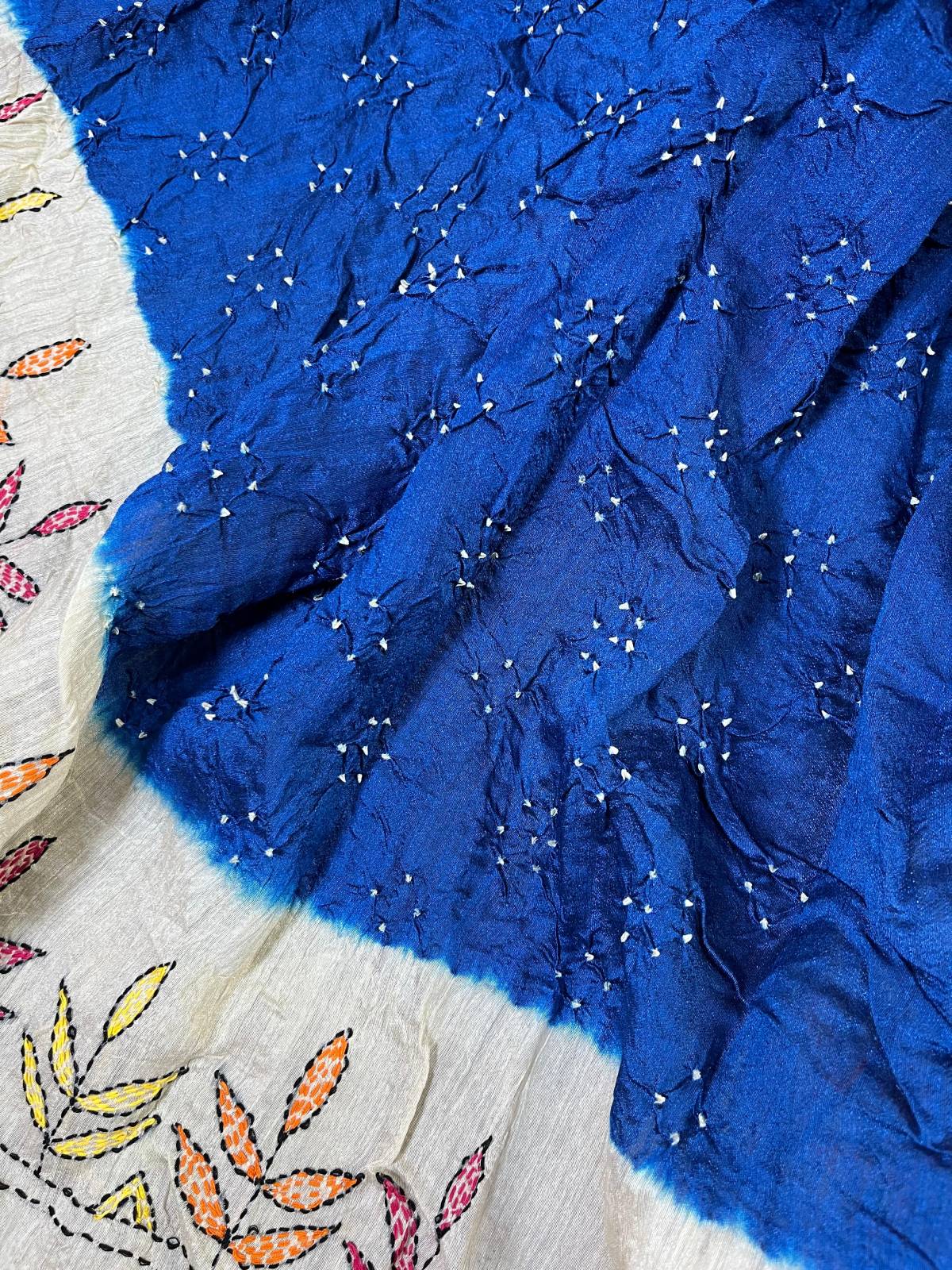 Immerse in the elegance of this blue tussar pure handloom Bandhej saree, adorned with intricate all-over Bandhej weaving that reflects fine traditional craftsmanship. Its delicate Kantha-woven border and palla add a touch of artistic heritage, enhancing the saree’s refined charm. Paired with a matching running blouse piece, this drape is a statement blend of texture, artistry, and timeless grace—perfect for festive and special occasions.