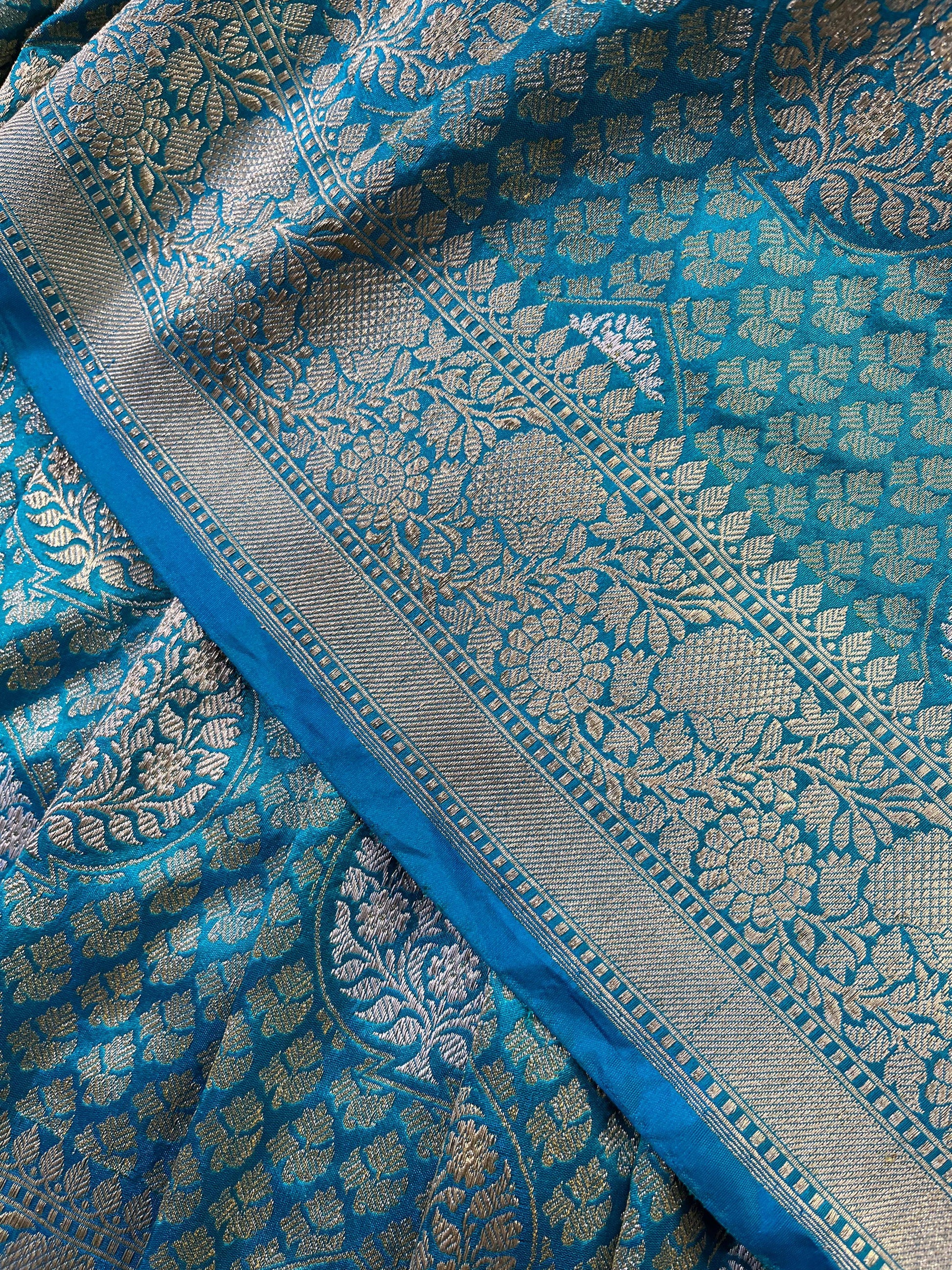 Exude refined elegance with this blue tissue silk pure handloom Banarasi saree, adorned with all-over intricate gold and silver weaving that creates a luminous, regal appeal. The saree is beautifully framed with an intricate woven border and a richly detailed palla, reflecting timeless Banarasi craftsmanship. Paired with a matching running blouse piece, this exquisite drape is perfect for weddings, festive gatherings, and grand celebrations.