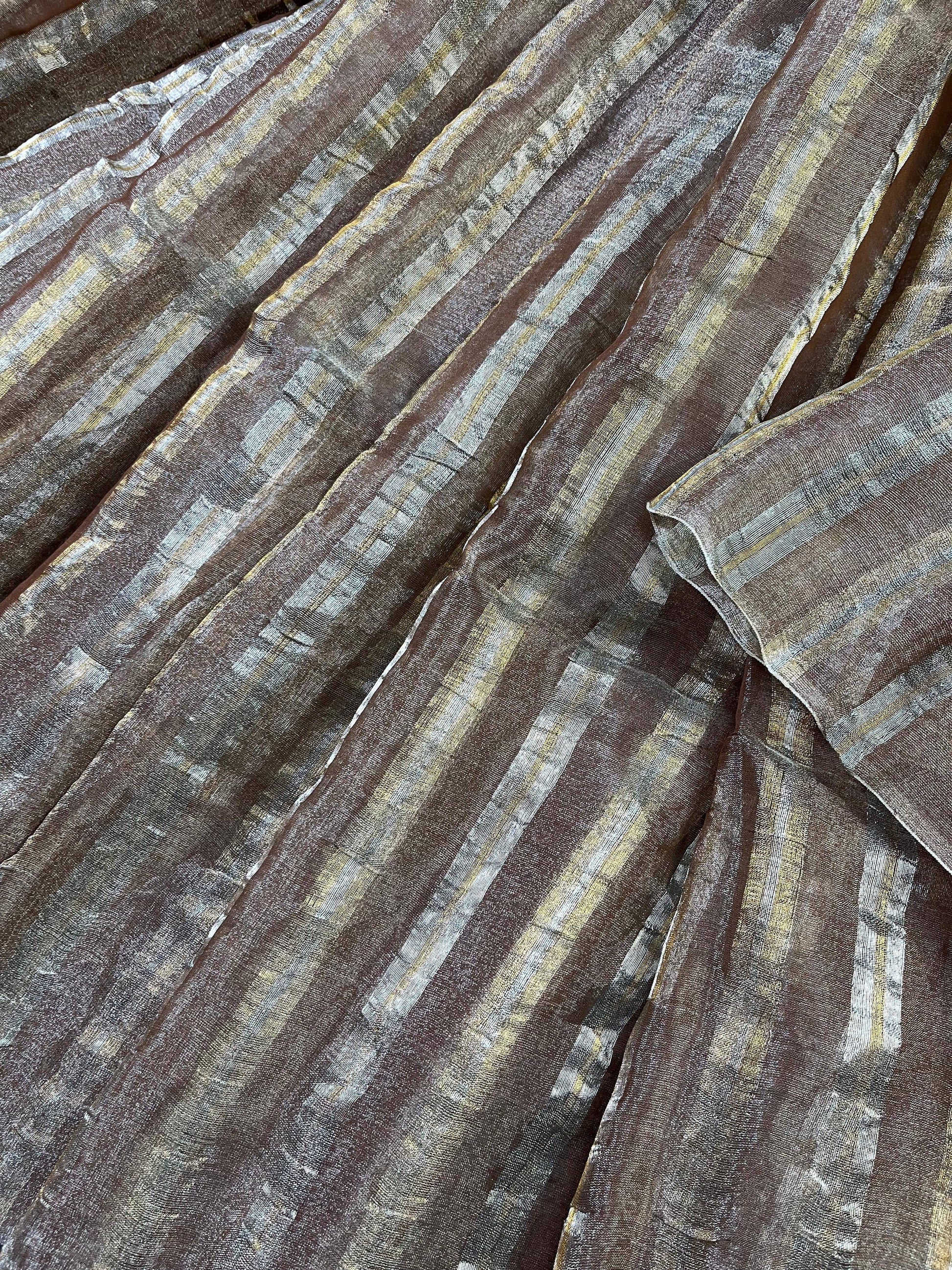 Elegant cappuccino tissue-line linen saree crafted in pure handloom, featuring all-over gold and silver intricate stripes for a subtle, shimmering look. Designed with a scalloped border, jari stripe palla, and paired with a matching running blouse piece. Perfect for classy festive and contemporary occasions.