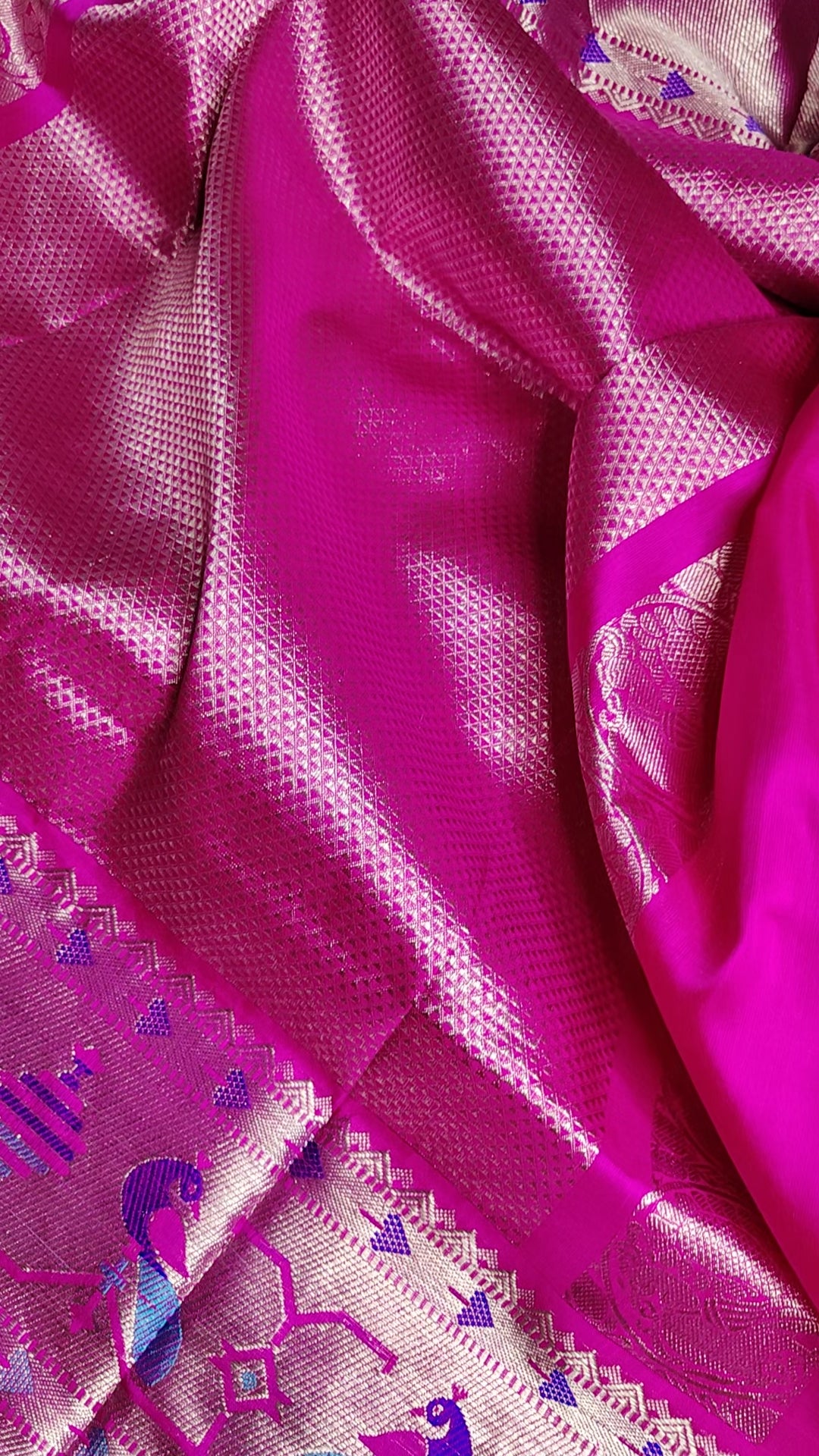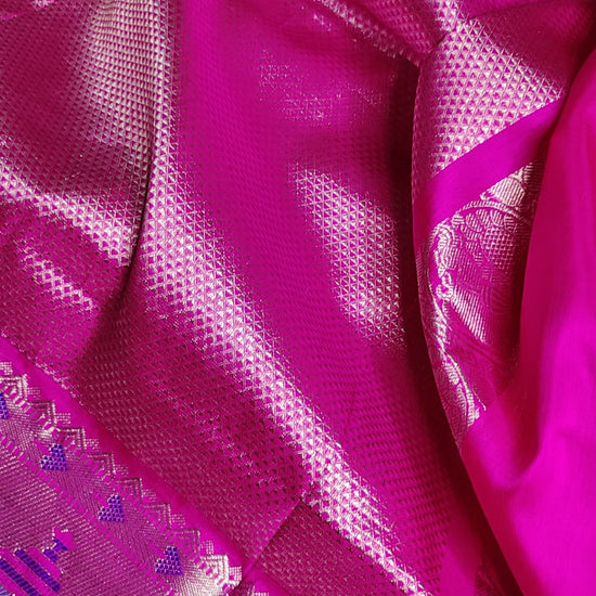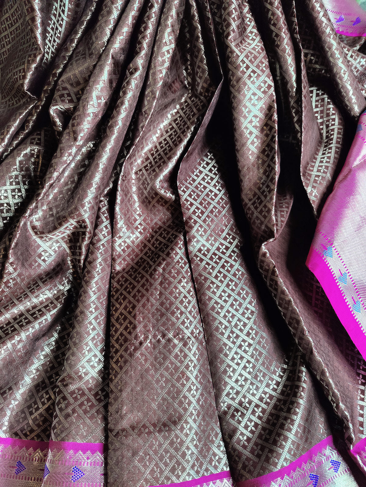 CHOCLATE BROWN SILK PURE HANDLOOM VENKATAGIRI SAREE WITH ALL OVER BROCADE WITH SILVER PINK PEACOCK SKIRT BORDER WITH PINK PEACOCK PALLA