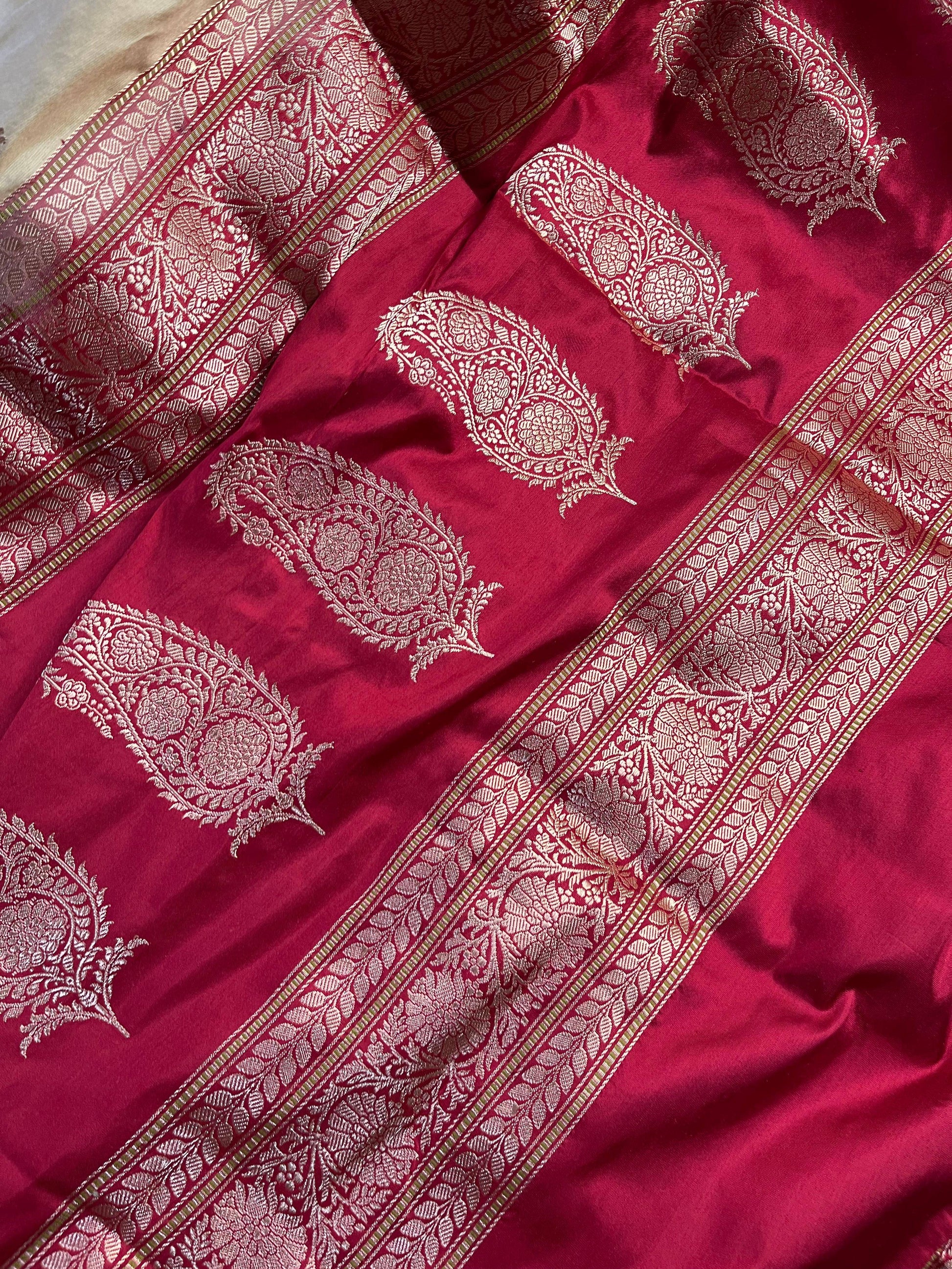 Graceful and timeless, this cream silk pure handloom Banarasi saree features all-over small intricate butta that lend a delicate, regal charm. The look is beautifully enhanced with a rich red intricate border and matching palla, adding a striking contrast and traditional elegance. Completed with a coordinated running blouse piece, this saree is perfect for weddings, festive occasions, and classic celebrations.
