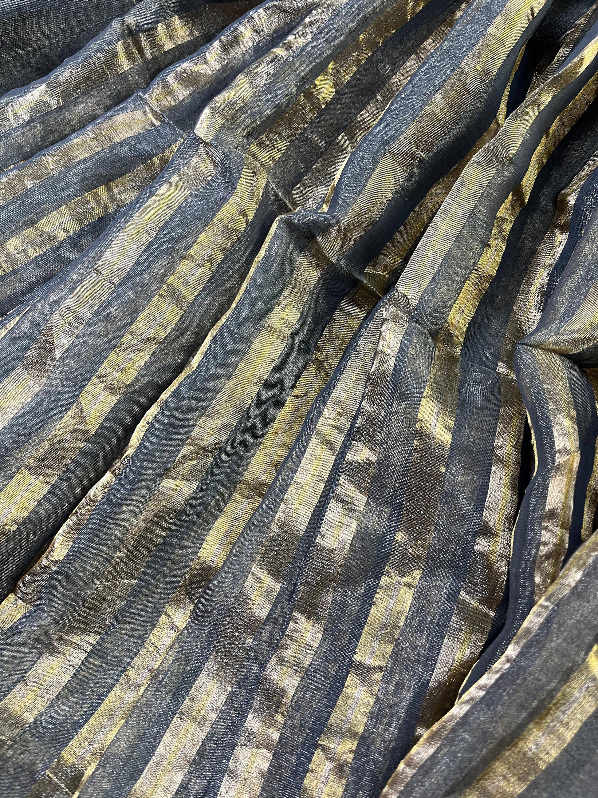 Elegant dark grey tissue-line linen saree crafted in pure handloom, featuring all-over gold and silver intricate stripes for a subtle, shimmering look. Designed with a scalloped border, jari stripe palla, and paired with a matching running blouse piece. Perfect for classy festive and contemporary occasions.