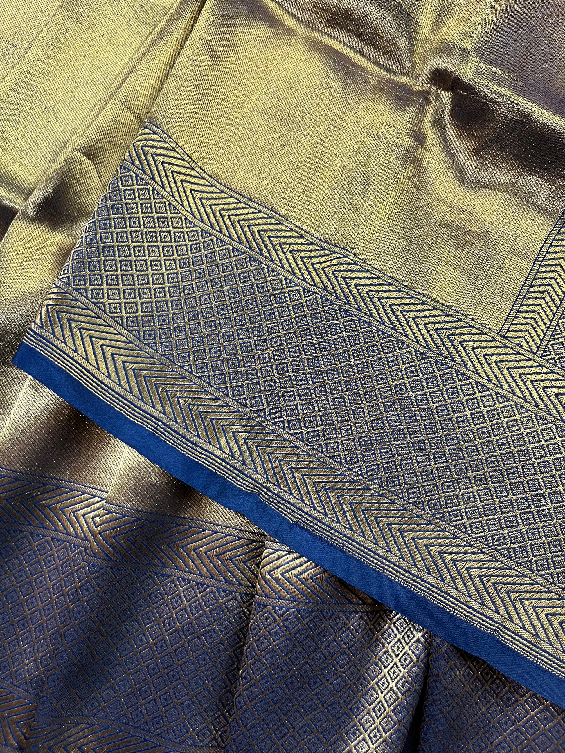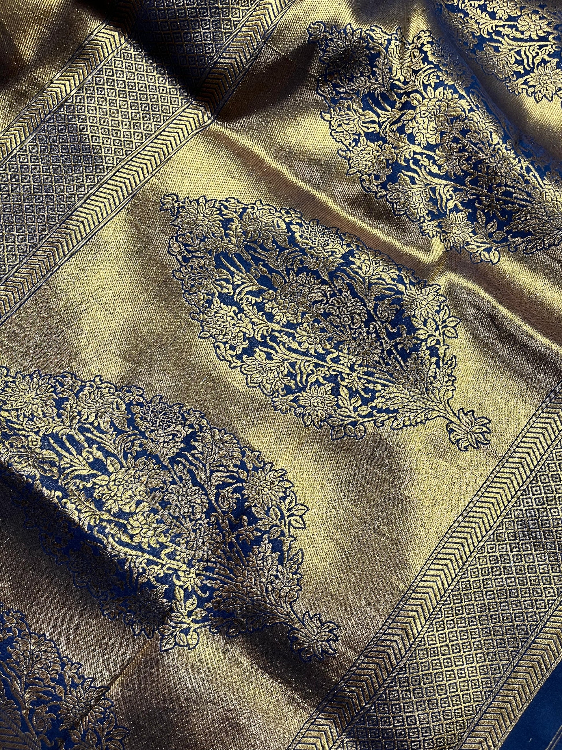 Gold katan tissue pure handloom Banarasi saree featuring an elegant all-over plain body that radiates a rich, lustrous sheen. The saree is beautifully enhanced with an intricate zari border and palla, showcasing traditional craftsmanship and delicate detailing. A striking dark-blue selvedge adds a bold contrast, elevating the overall appeal. Paired with a matching running blouse piece, this saree is a timeless choice for festive and wedding occasions — graceful, luxurious, and effortlessly grand.