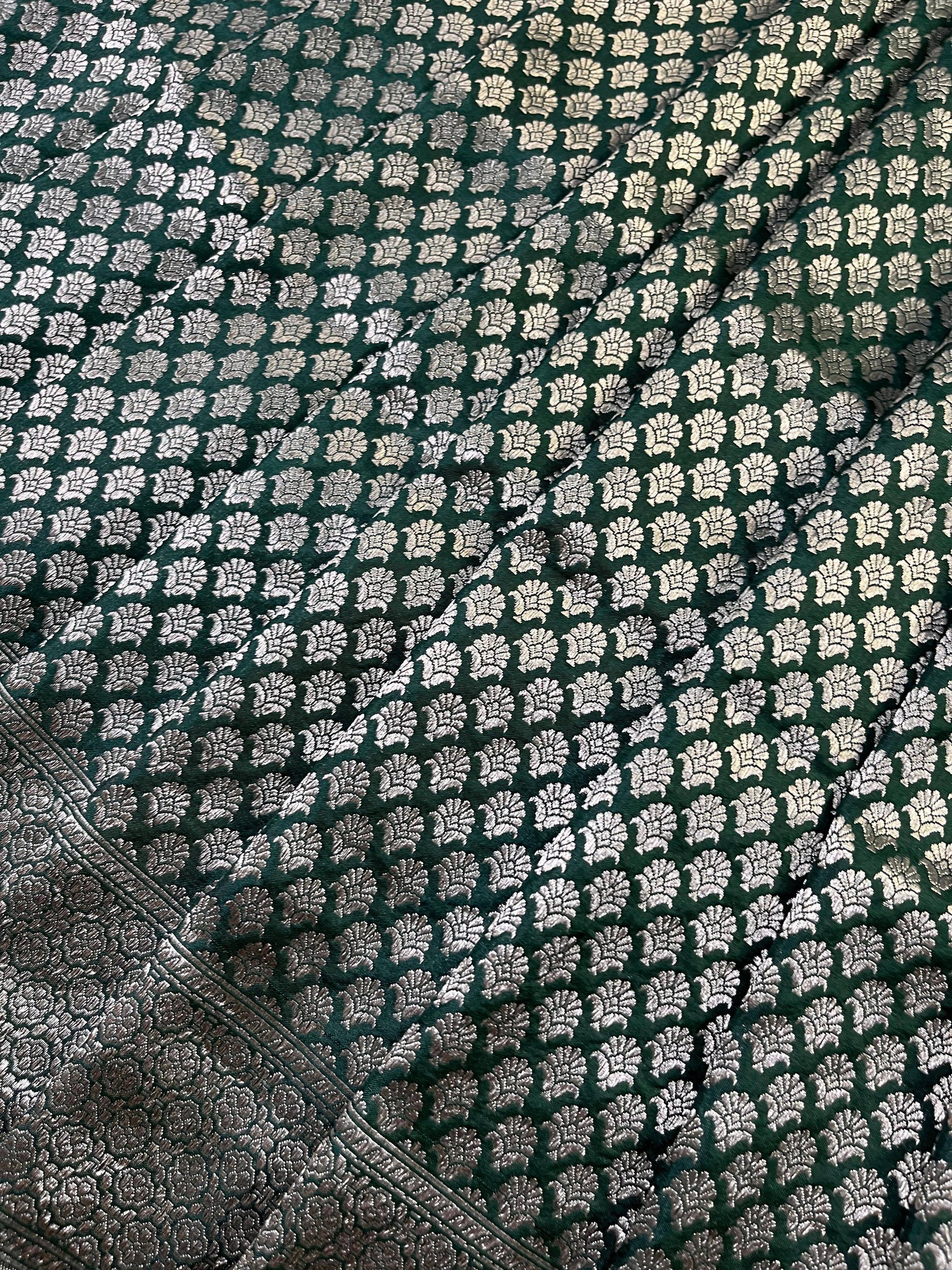 A beautiful blend of tradition and sophistication, this pure handloom Banarasi saree is woven in rich green Chiniya silk, known for its smooth texture and graceful drape. The saree features all-over small floral butti motifs, delicately crafted to add subtle charm and intricate detail. Accentuating its beauty are the finely woven border and an ornate palla, reflecting the timeless artistry of Banarasi craftsmanship. Paired with a matching running blouse piece, this saree is perfect for weddings, festive celebrations, and special occasions.