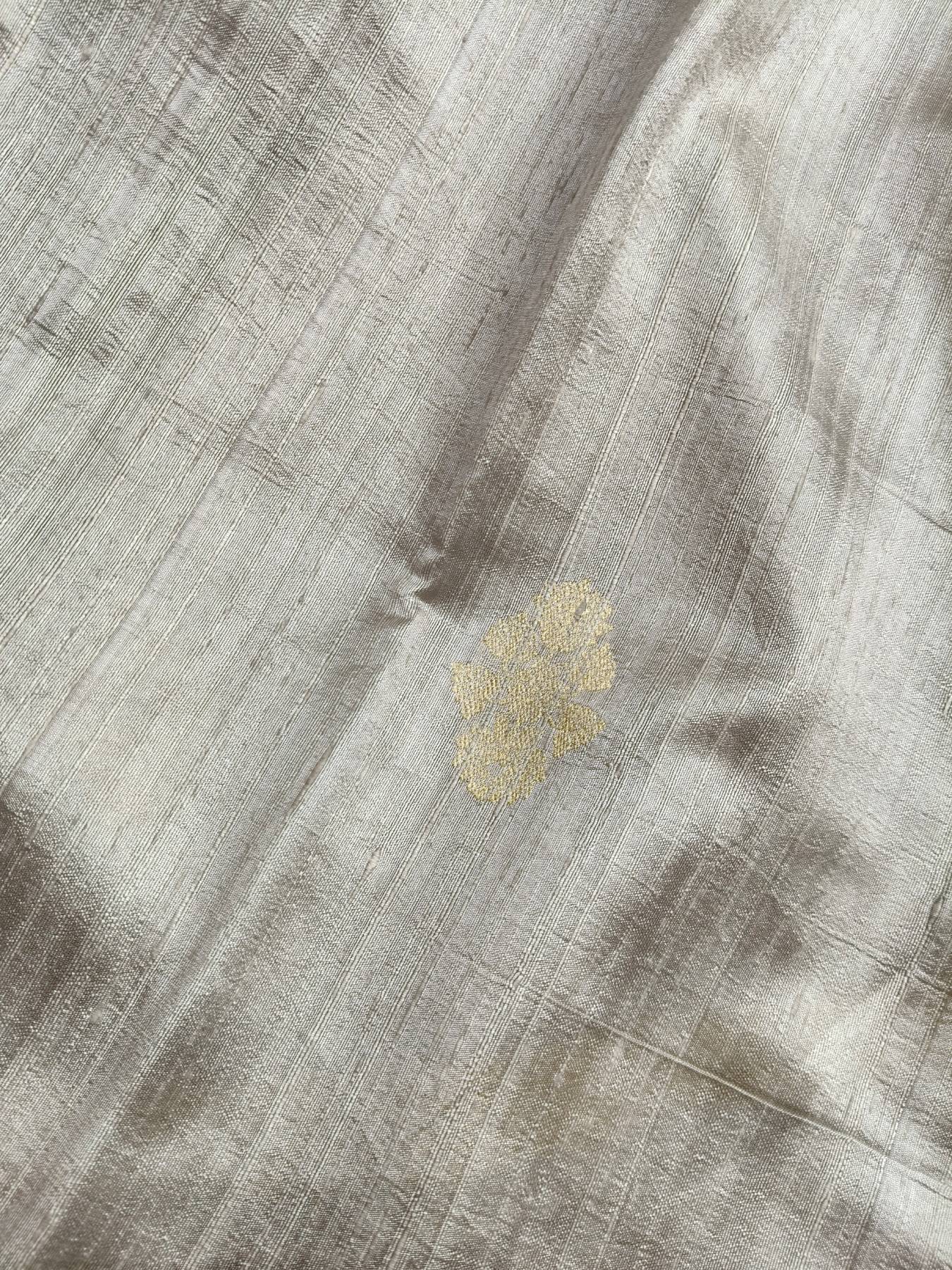 GREY AND SEA BLUE SHADED DUPION SILK PURE HANDLOOM BANARASI SAREE WITH ALL OVER GOLD FLOWER BUTTA GOLD BORDER AND PALLA WITH SEA BLUE RUNNING BLOUSE PIECE