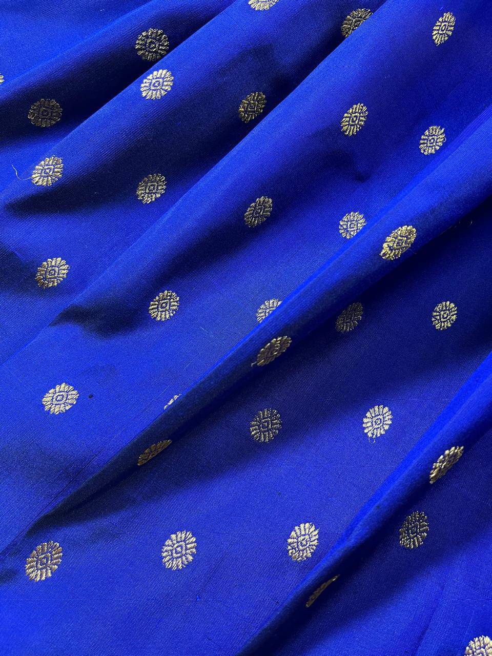 ink blue pure silk Paithani saree, adorned with all-over gold flower buttas that add a rich and luminous appeal. The saree is beautifully bordered with a gold Narali border, enhancing its classic Paithani charm. Its intricate Maharani palla showcases exquisite detailing and timeless craftsmanship. Paired with a matching ink blue running blouse piece, this saree is a perfect choice for weddings, festive occasions, and grand celebrations.