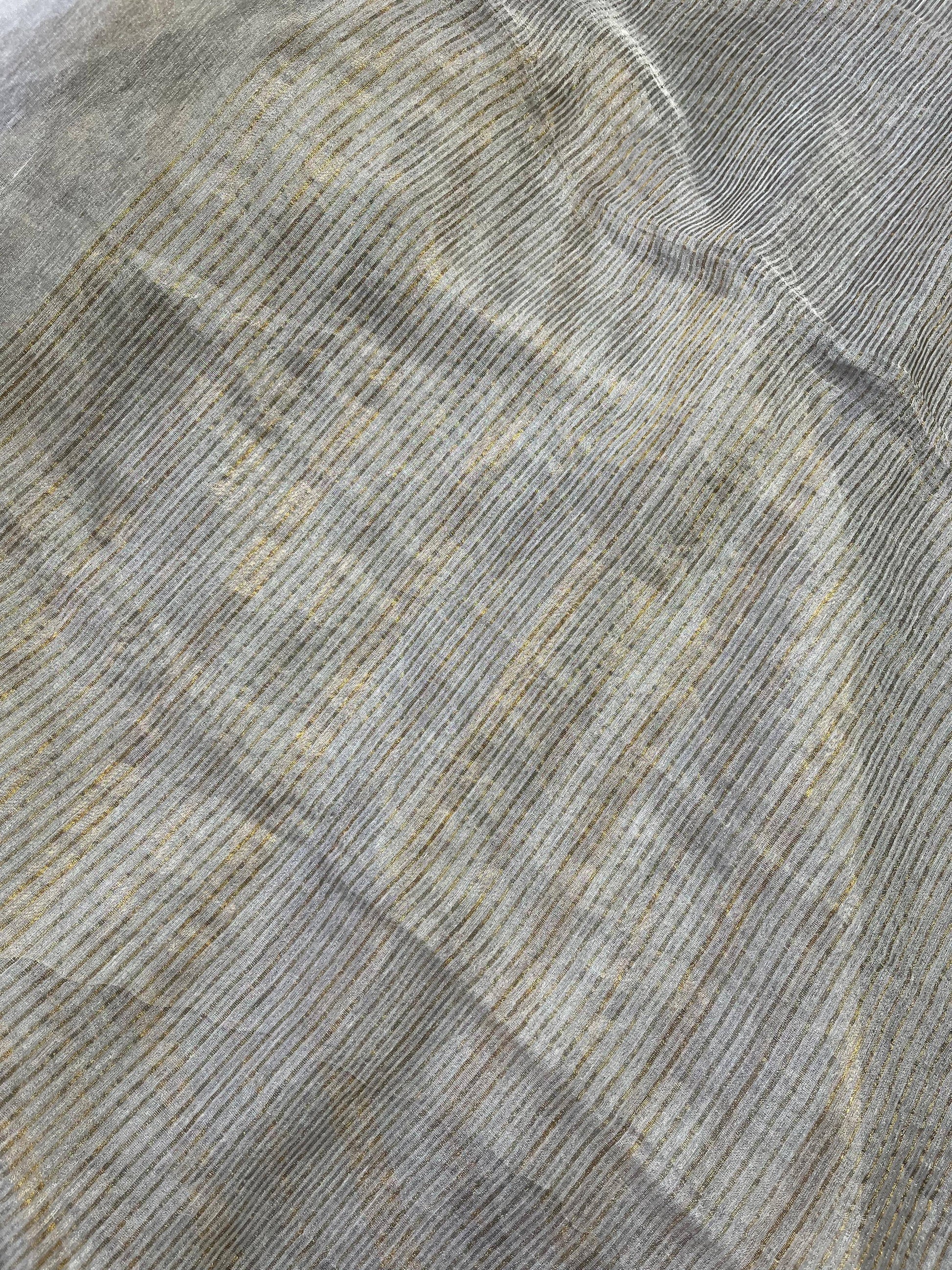 Elegant ivory tissue-line linen saree crafted in pure handloom, featuring all-over gold and silver intricate stripes for a subtle, shimmering look. Designed with a scalloped border, jari stripe palla, and paired with a matching running blouse piece. Perfect for classy festive and contemporary occasions.