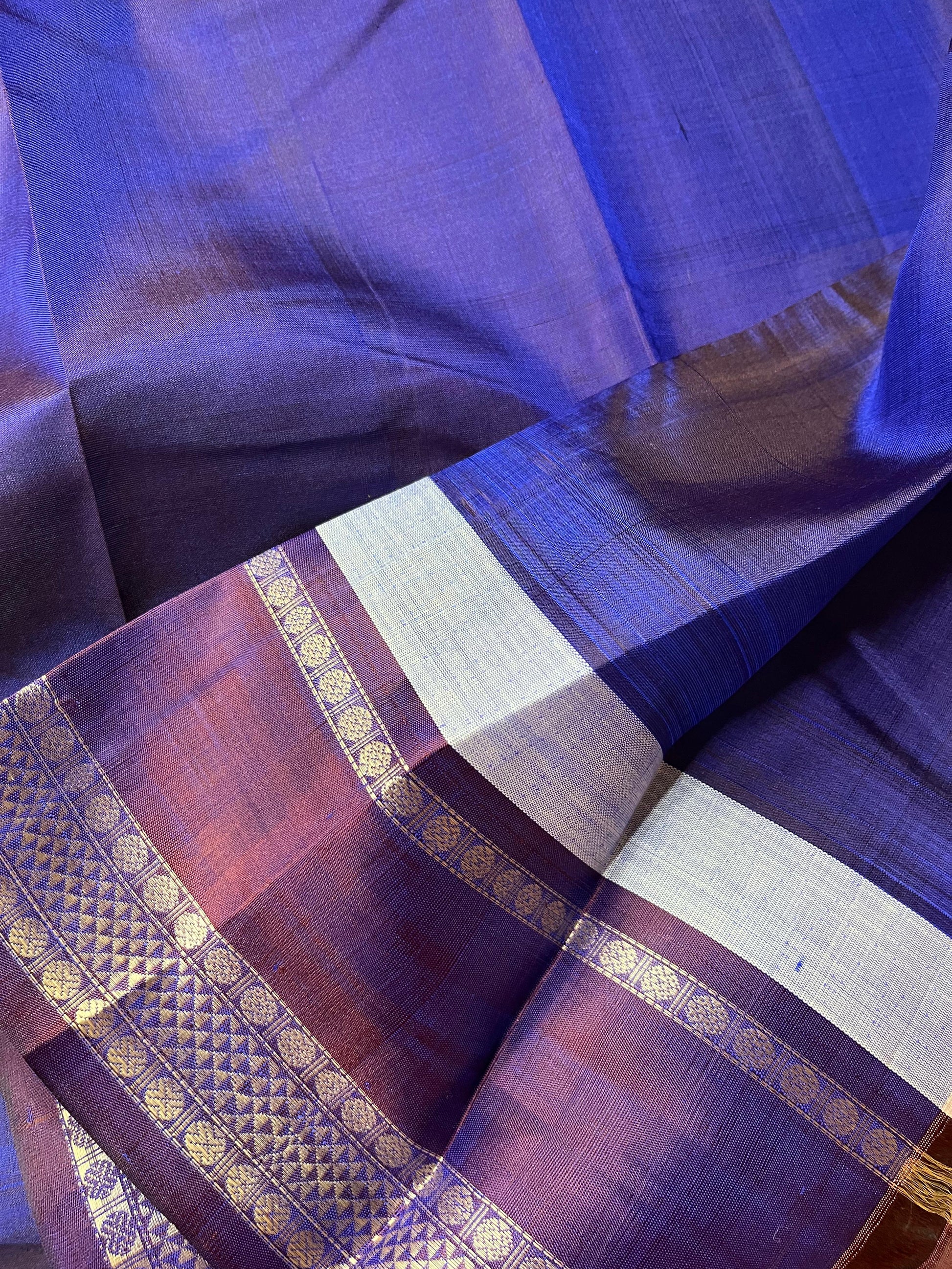 A soothing light mauve cotton pure handloom Kanjivaram saree crafted in elegant simplicity with an all-over plain body. It features a distinctive Ganga-Jamna border, adding dual-tone charm, and is paired with a blue palla. Completed with a matching running blouse piece, this drape beautifully balances subtlety and tradition—perfect for festive and everyday grace.
