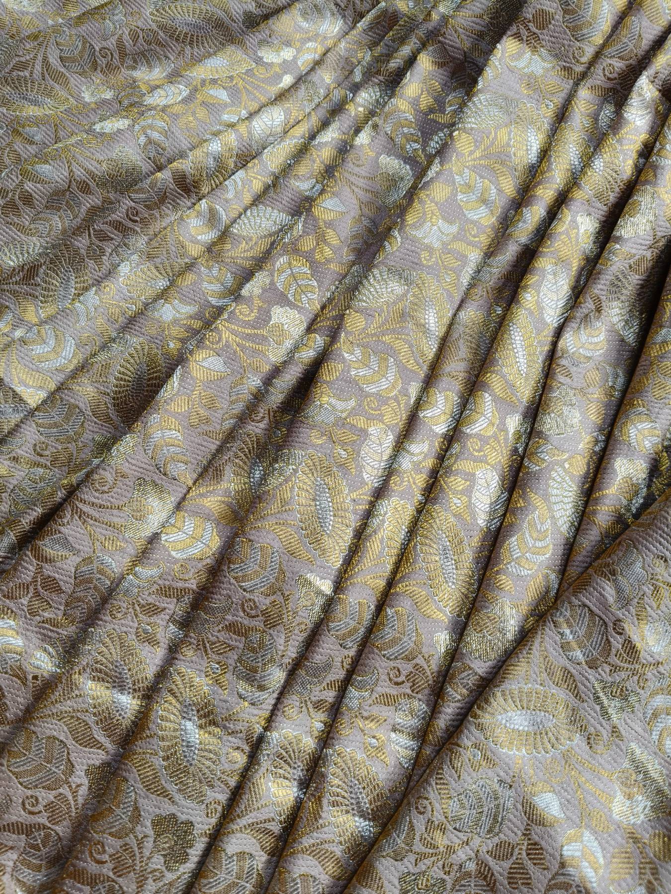 A timeless Silk Banarasi saree adorned with an all-over intricate floral jaal in gold and silver zari. The saree is beautifully complemented by a detailed border and an elegant palla, paired with a matching running blouse piece for a complete traditional look.”
