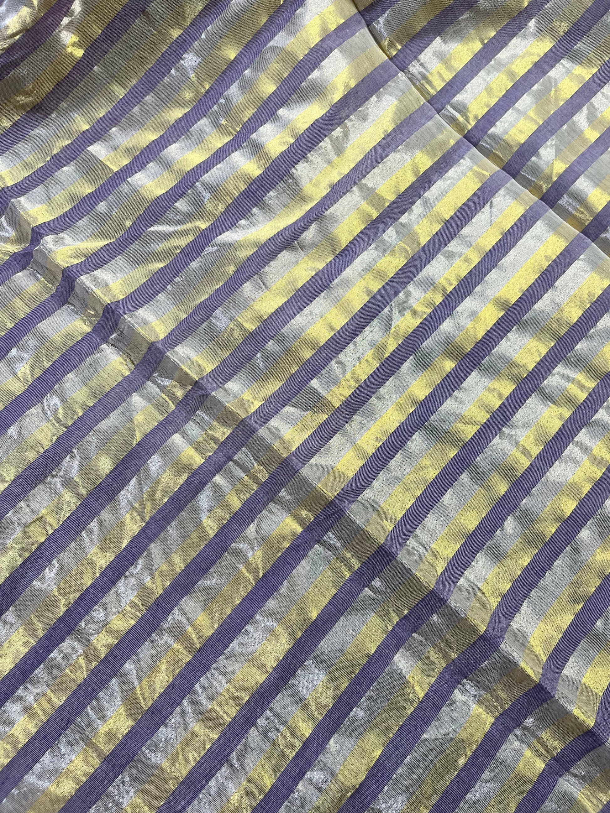 A graceful lilac pure handloom Kerala cotton saree, adorned with all-over gold and silver woven stripes that lend a subtle festive glow. The saree is beautifully complemented by a coordinated gold–silver striped palla and comes with a matching running blouse piece. Soft, breathable, and elegant, this timeless drape is perfect for festive mornings, traditional gatherings, and everyday sophistication.