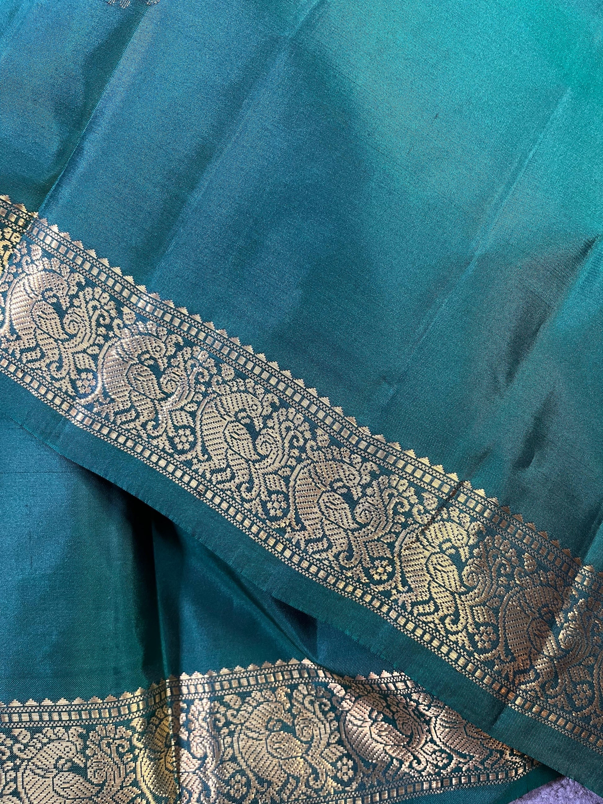 Mehendi green to dark green pure handloom Mubbagam Kanjivaram silk saree featuring a rich all-over plain body, complemented by an intricate gold zari border. The palla showcases detailed kuniya craftsmanship, adding depth and tradition to the weave. Paired with a matching running blouse piece, this saree exudes timeless elegance and heritage charm.