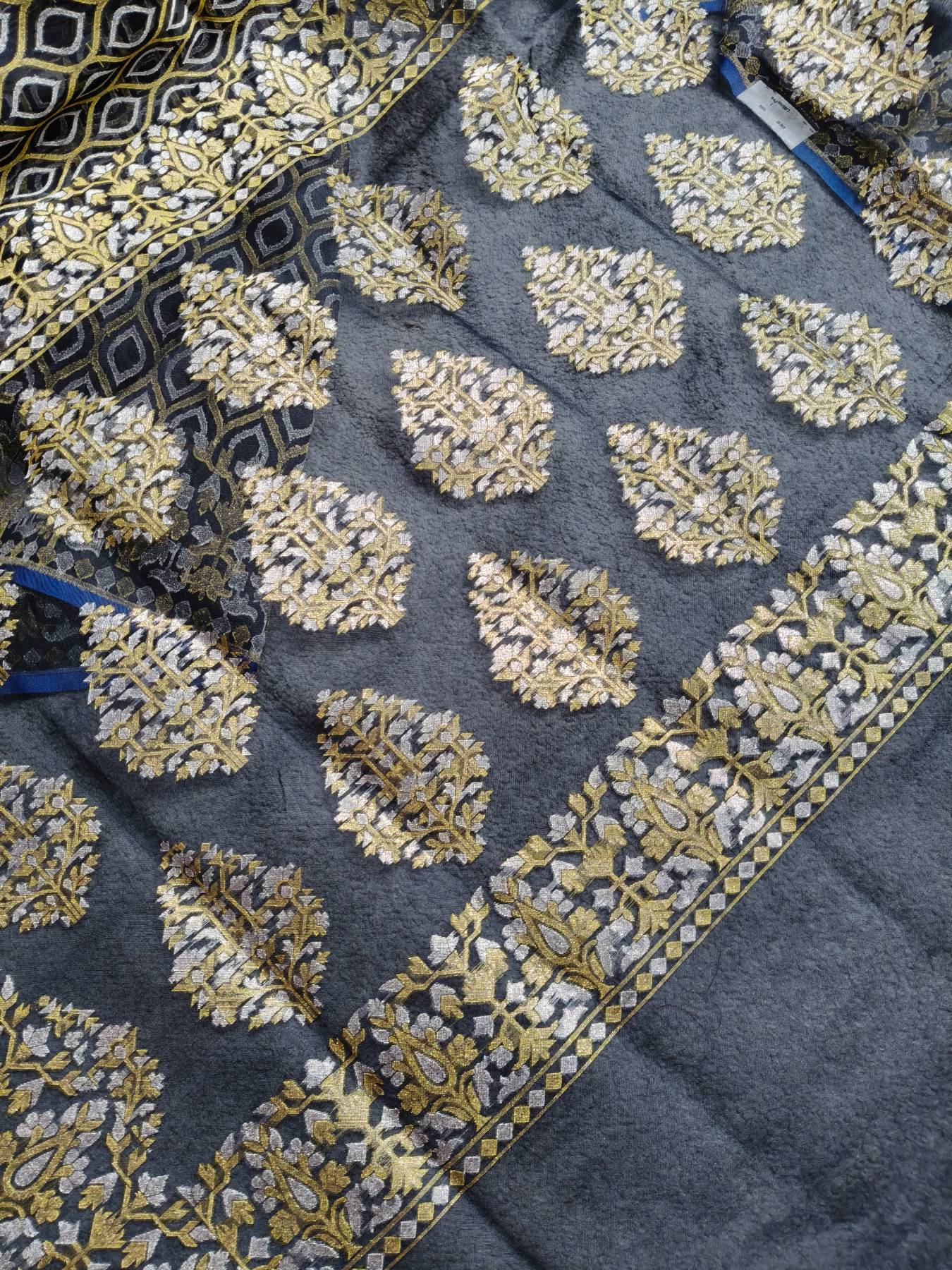 MIDNIGHT BLUE KORA COTTON PURE HANDLOOM BANARASI SAREE WITH ALL OVER GOLD SILVER BROCADE WEAVING WITH GOLD SILVER BROCADE BORDER AND PALLA AND BLUE GOLD SILVER BUTTA RUNNING BLOUSE PIECE