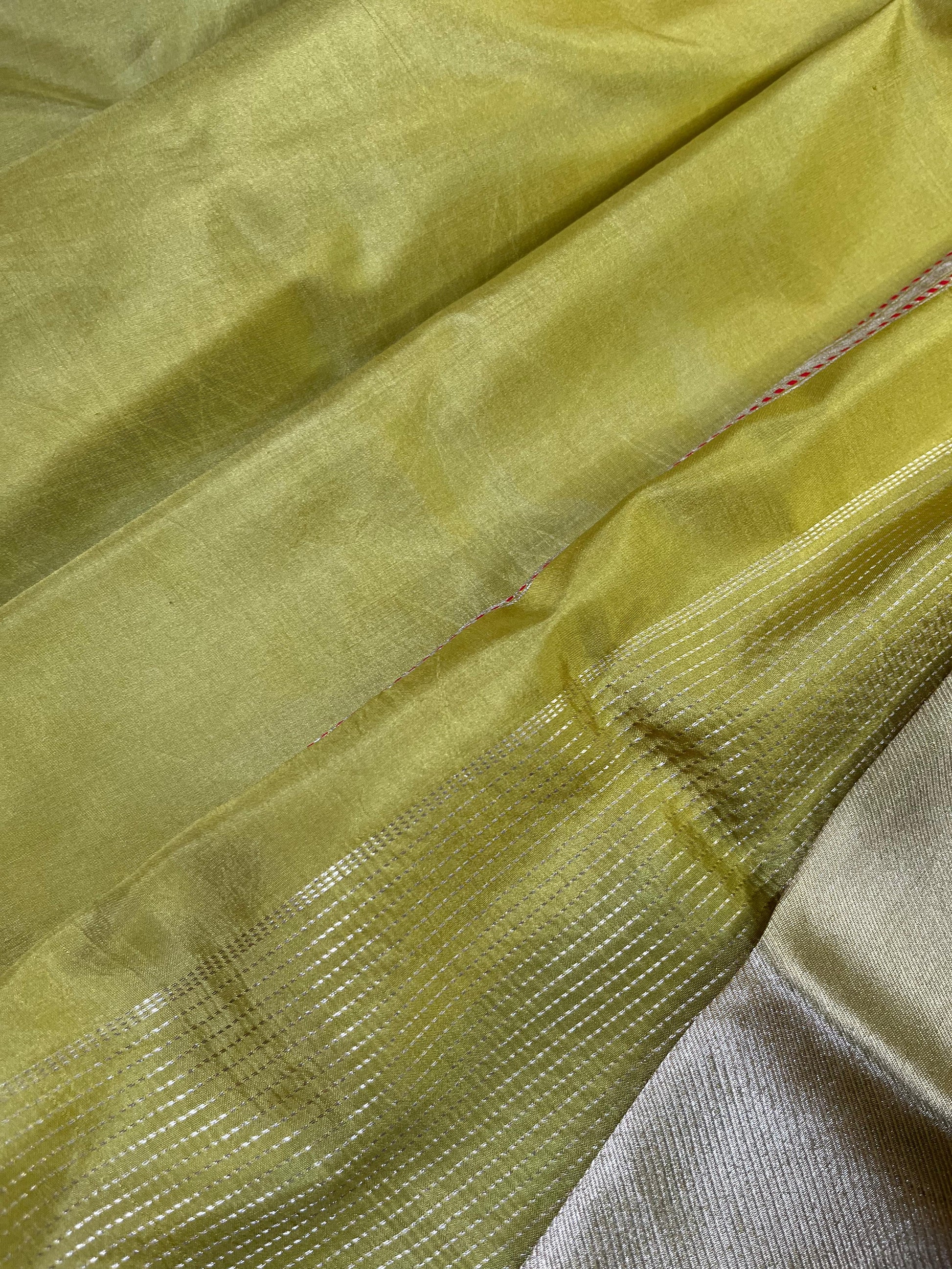 Neon green katan tissue pure handloom Banarasi saree featuring a lustrous all-over plain weave that highlights its rich texture and contemporary appeal. The saree is beautifully complemented with a striking chevron-style zari border, adding a modern twist to traditional craftsmanship. Its intricate pejli palla showcases fine detailing, enhancing the elegance of the drape. Paired with a matching running blouse piece, this saree is a perfect blend of subtle luxury and cultural artistry — ideal for festive, wedding, and grand occasions.