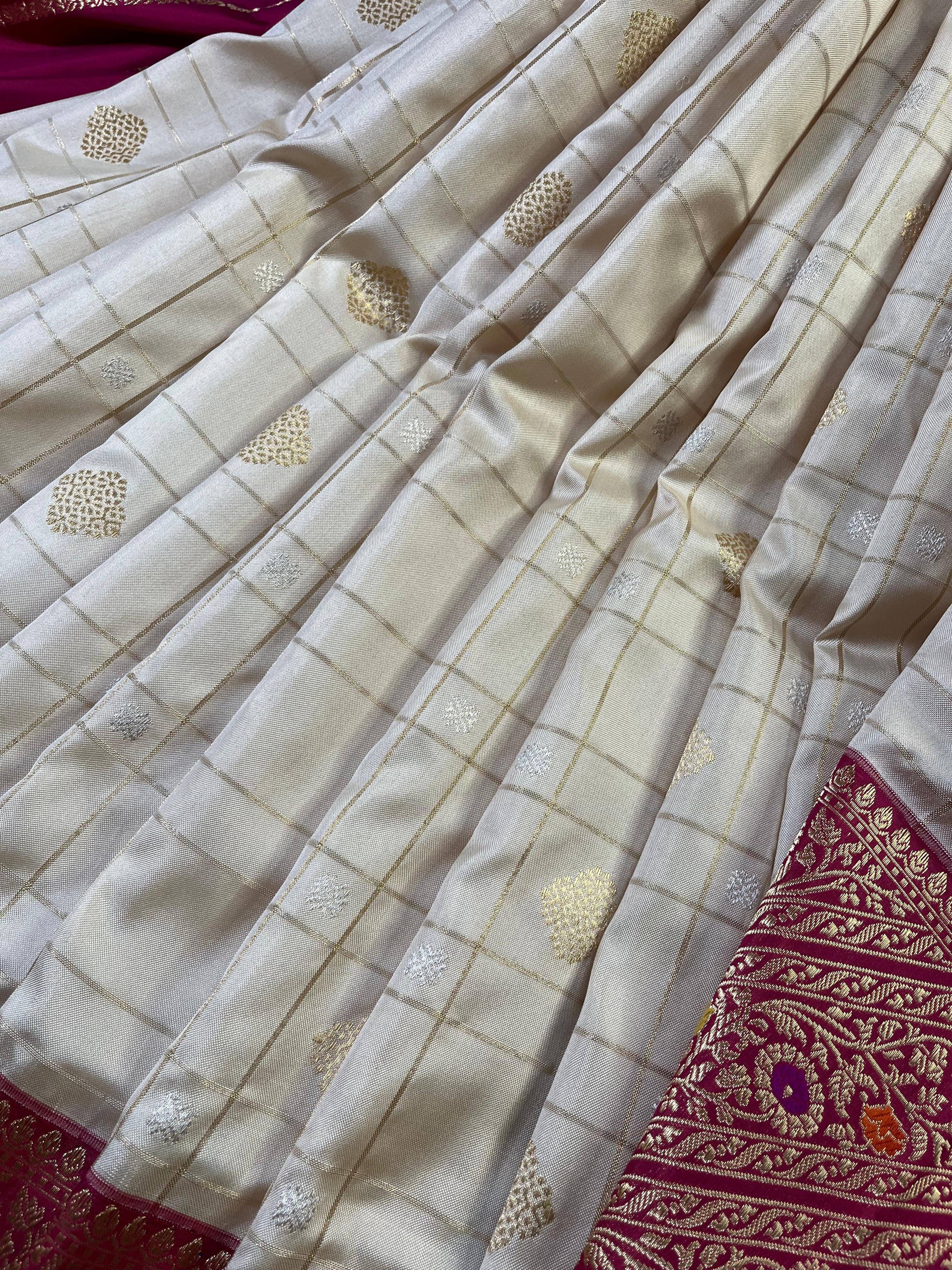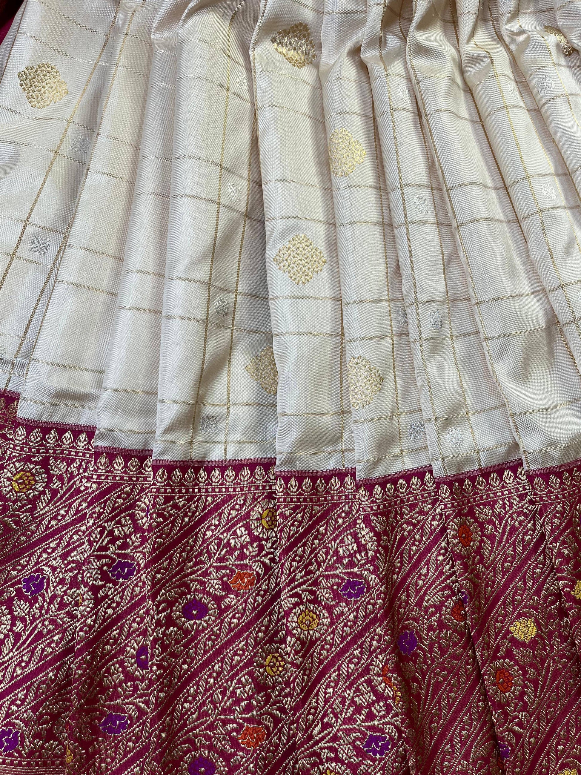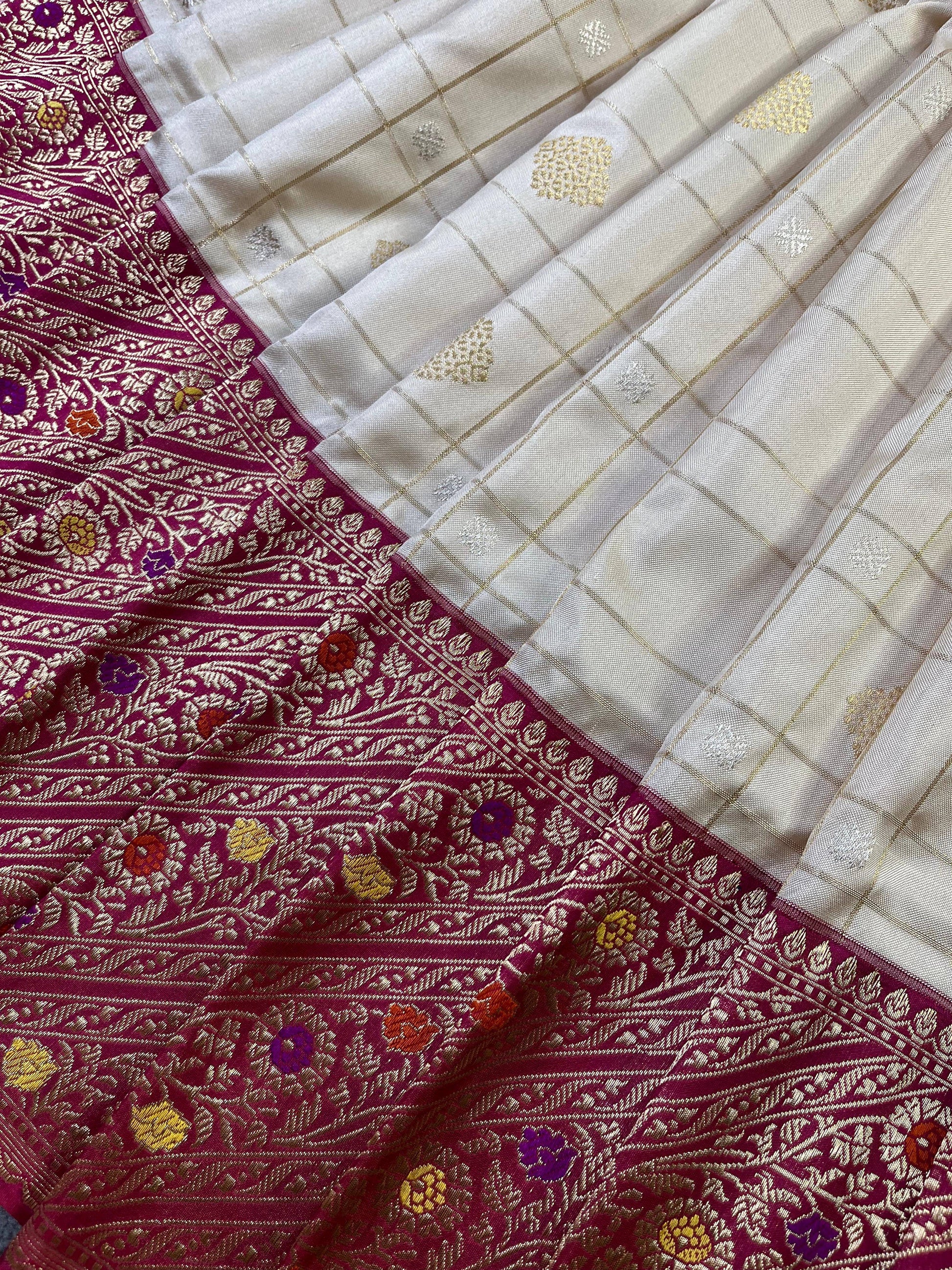 Off-white pure handloom Banarasi silk saree featuring elegant all-over checks beautifully highlighted with gold and silver butta. The saree is enriched with a graceful pink meenakari kadua-woven border and palla, adding a soft pop of colour and traditional charm. Completed with a matching running blouse piece, this timeless Banarasi drape is perfect for weddings, festive occasions, and classic celebrations, reflecting refined craftsmanship and understated luxury