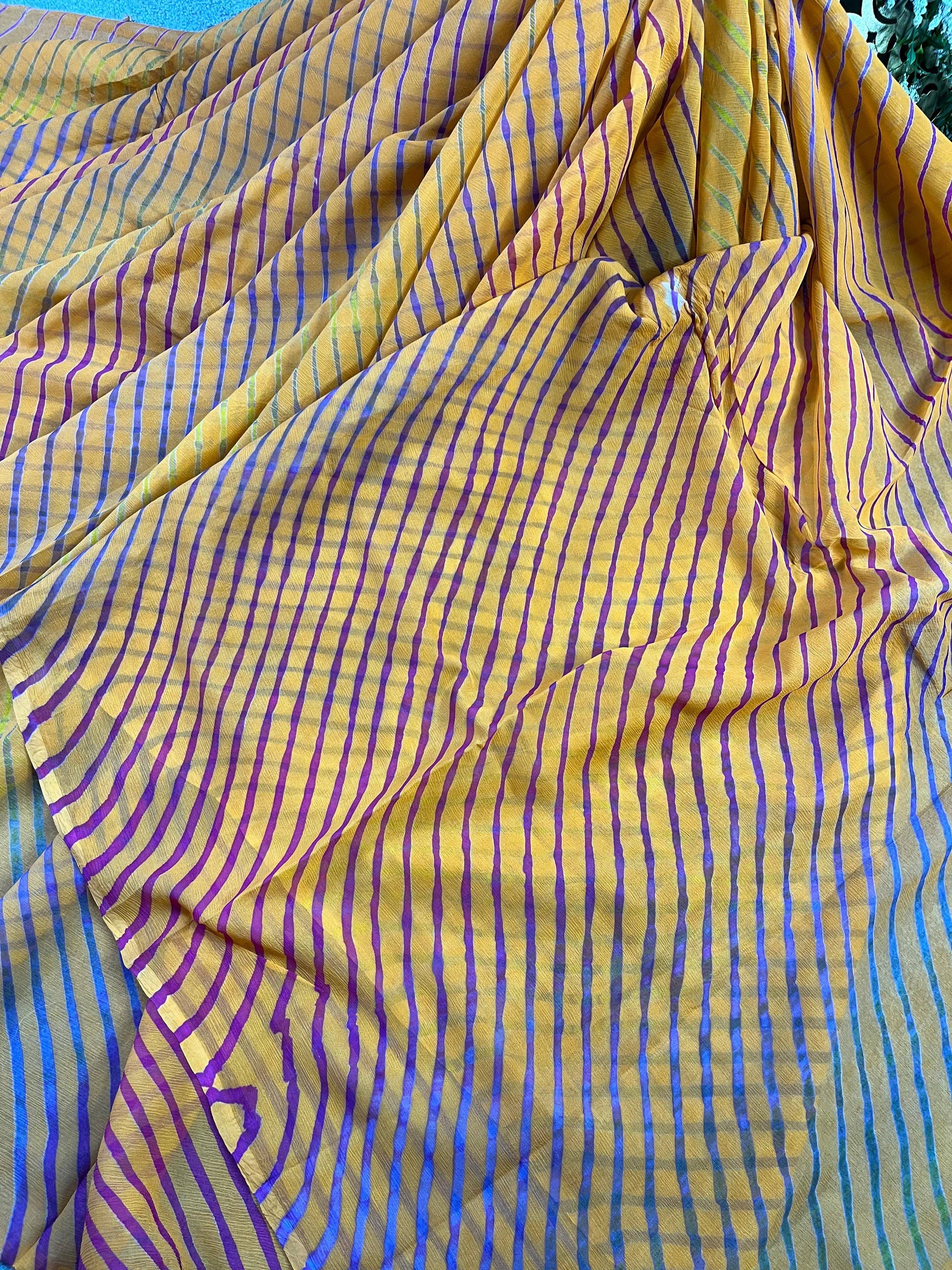 This orange leheriya Crafted in airy chiffon, this vibrant tie & dye leheriya saree captures the spirit of Rajasthan with its flowing drape, radiant colors, and effortless elegance perfect for festive celebrations or chic soirées