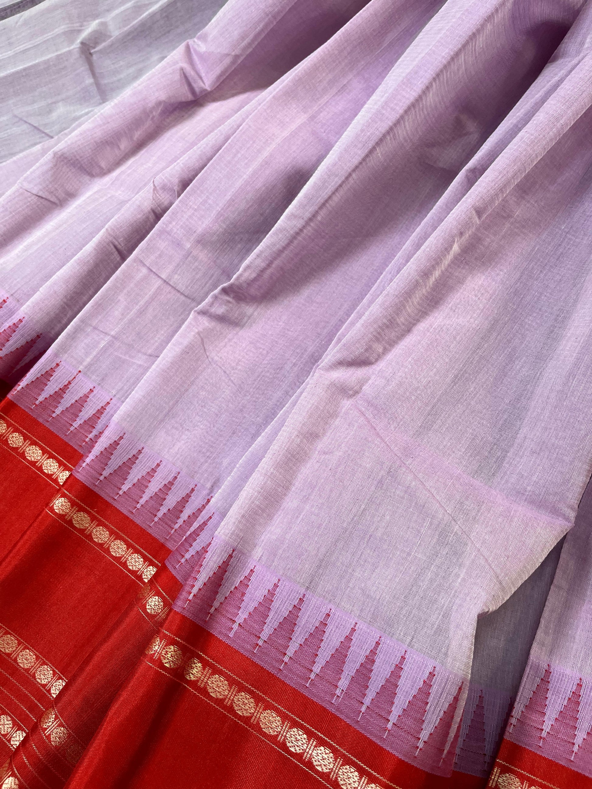 A charming pink cotton pure handloom Kanjivaram saree featuring an all-over plain body, beautifully highlighted with a rich red silk border and palla. Paired with a matching running blouse piece, this classic drape blends subtle elegance with traditional allure—perfect for festive and cultural occasions.