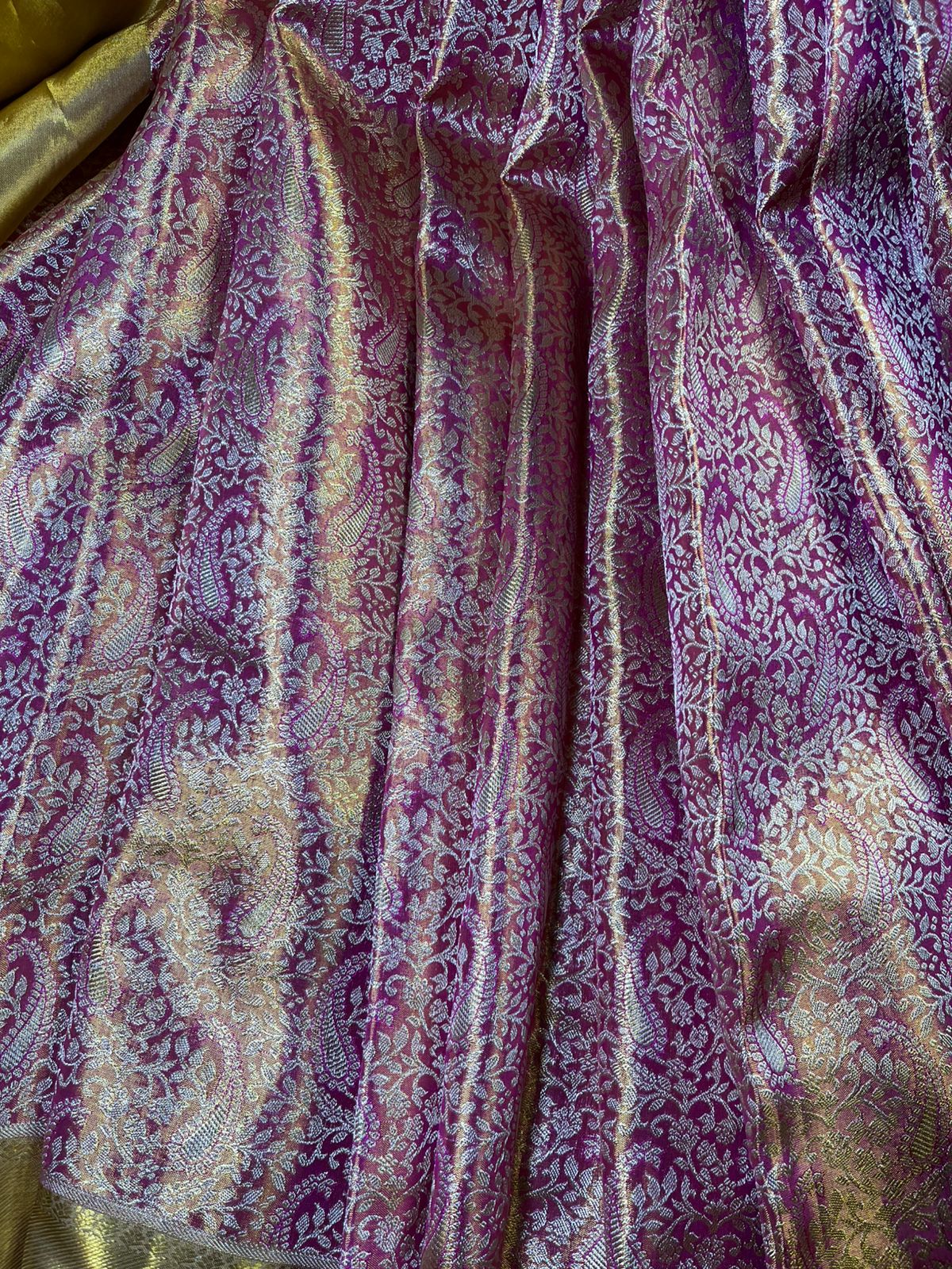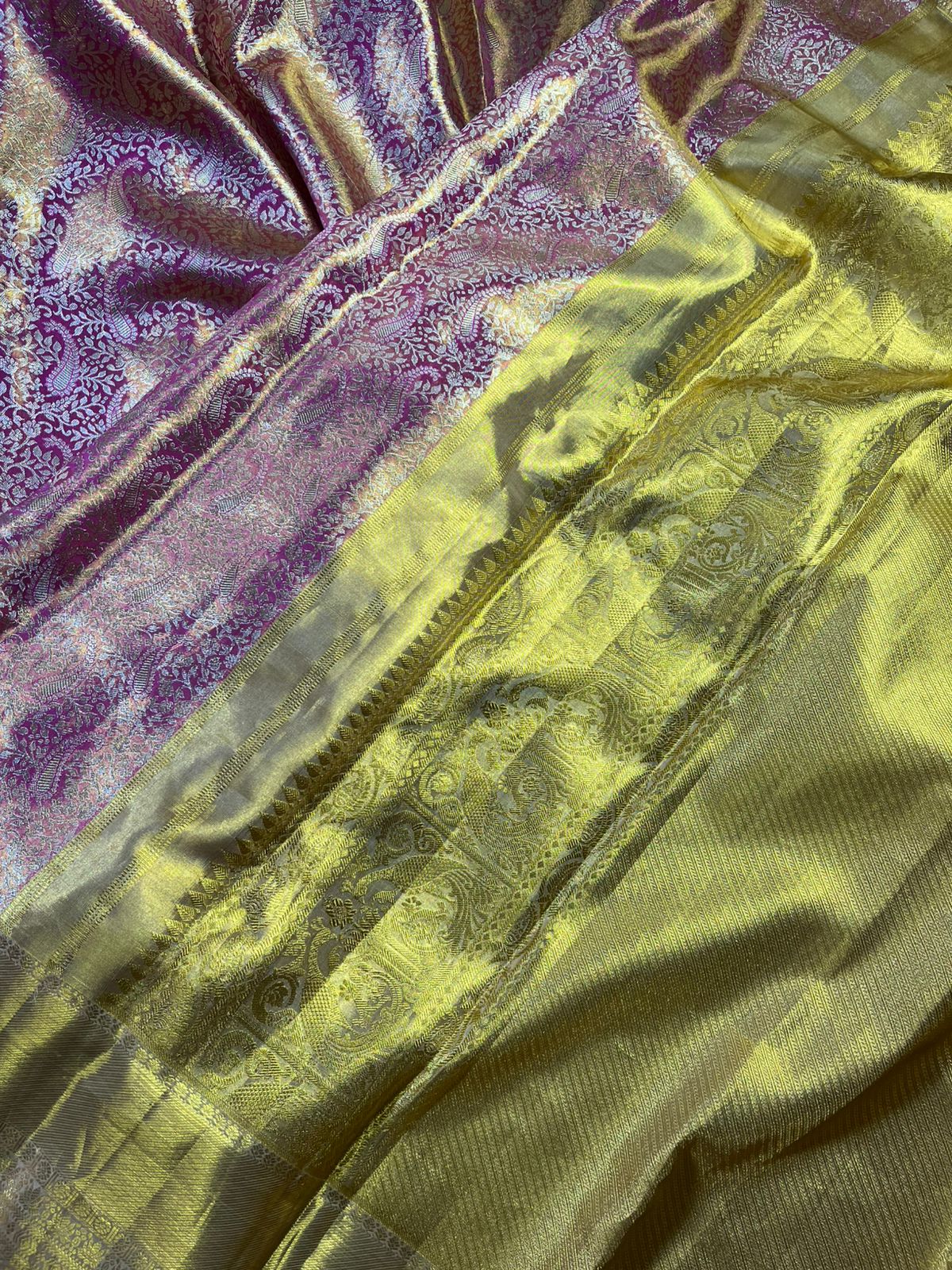 A luxurious gold tissue Kanjivaram saree featuring all-over intricate gold and pink brocade weaving. The body shimmers beautifully with floral–paisley motifs, complemented by a rich golden zari border and a matching ornate palla. Perfect for weddings and grand occasions