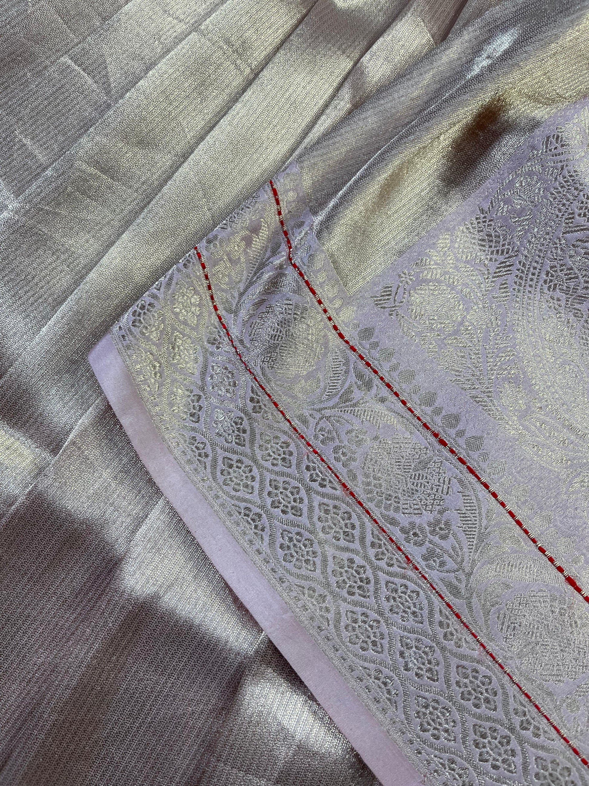 Pink katan tissue pure handloom Banarasi saree featuring elegant all-over woven stripes that lend a subtle sheen and texture to the drape. The saree is adorned with an intricate floral zari border and a beautifully detailed palla showcasing traditional kuniya craftsmanship, adding richness and heritage charm. Paired with a matching running blouse piece, this saree blends luxury and tradition — perfect for festive, wedding, and grand celebrations.
