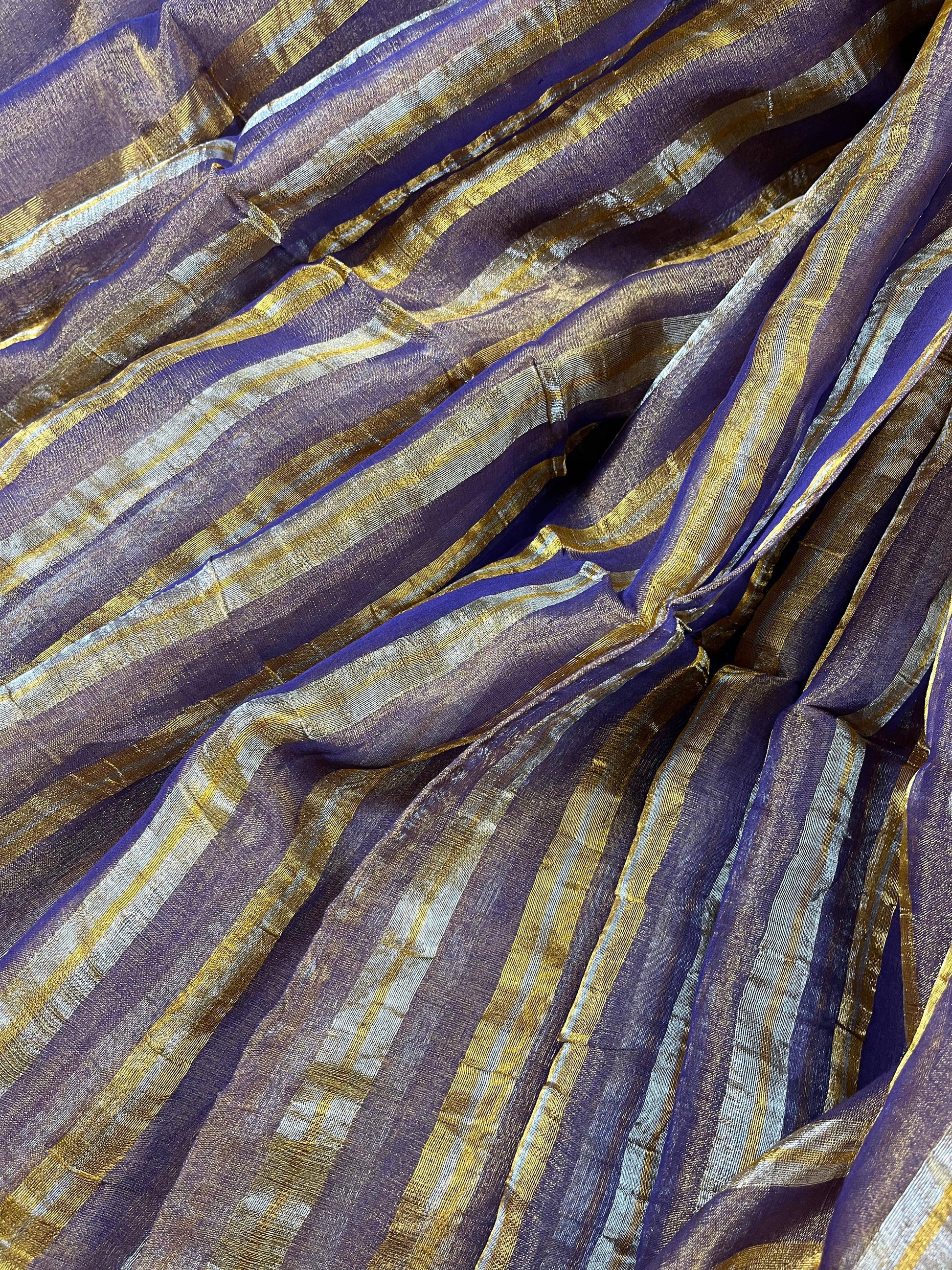 Elegant purple tissue-line linen saree crafted in pure handloom, featuring all-over gold and silver intricate stripes for a subtle, shimmering look. Designed with a scalloped border, jari stripe palla, and paired with a matching running blouse piece. Perfect for classy festive and contemporary occasions.