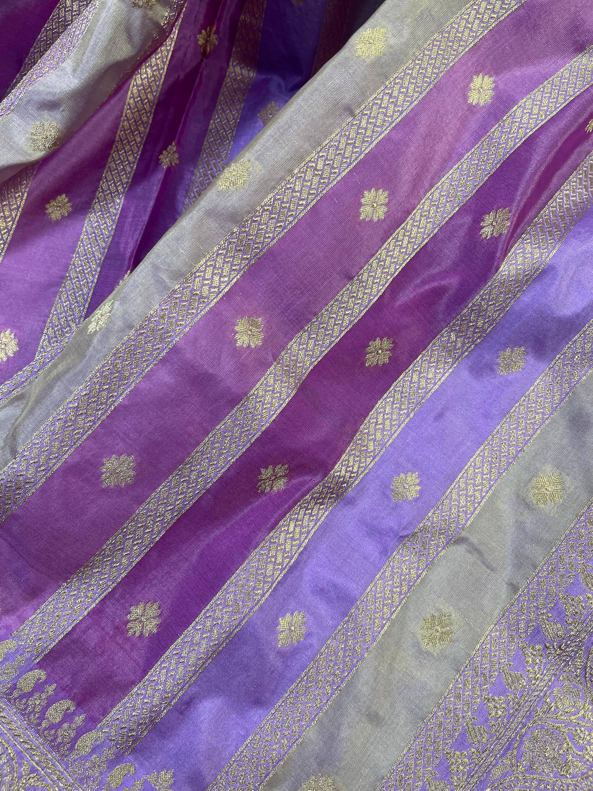 Rangkat silk pure handloom Banarasi dupatta featuring elegant all-over gold stripes highlighted with delicate gold small butti. Finished with an intricately woven meenakari daman and a rich, detailed border, this dupatta beautifully reflects the timeless artistry and grandeur of Banaras handloom craftsmanship.
