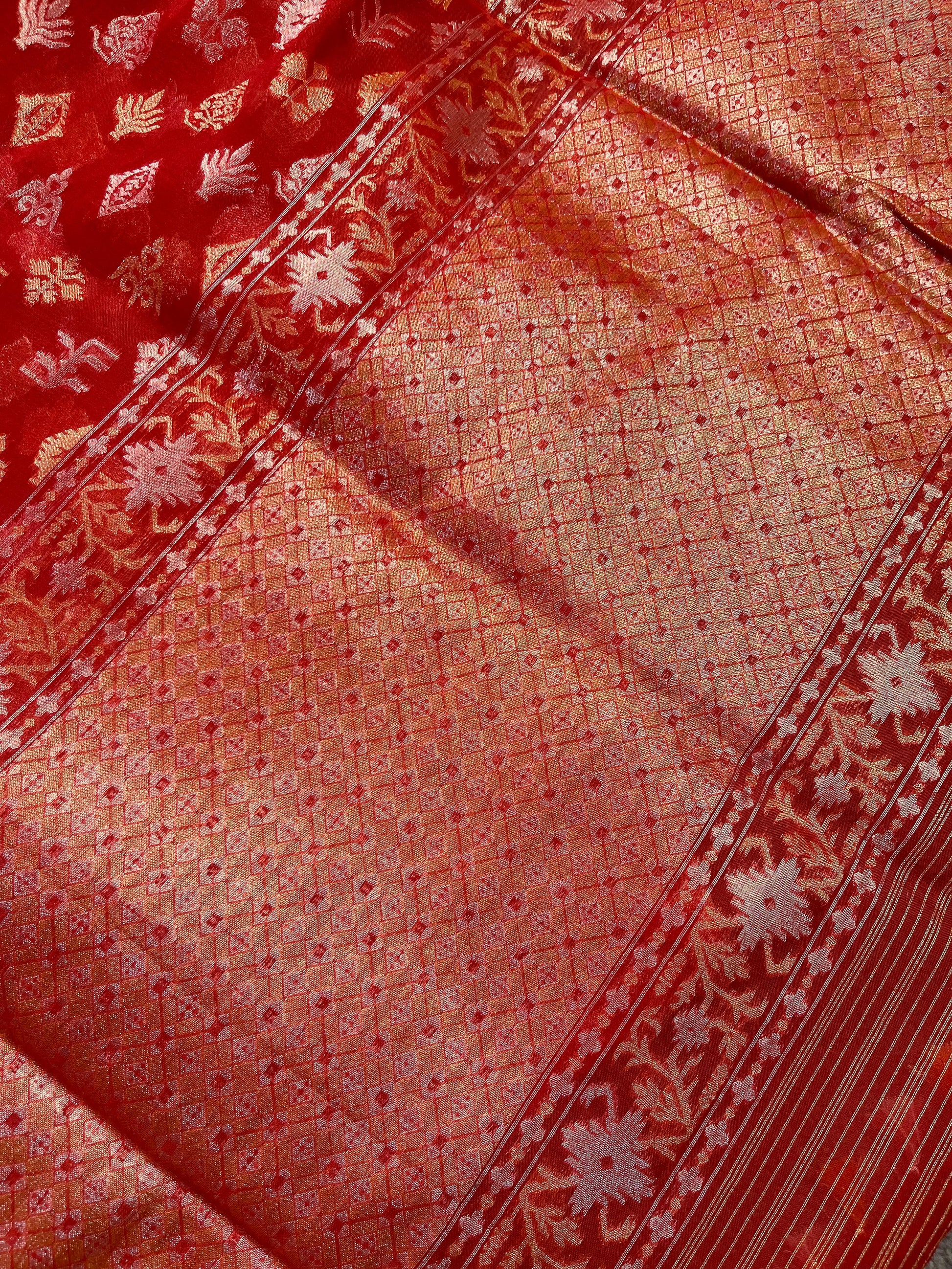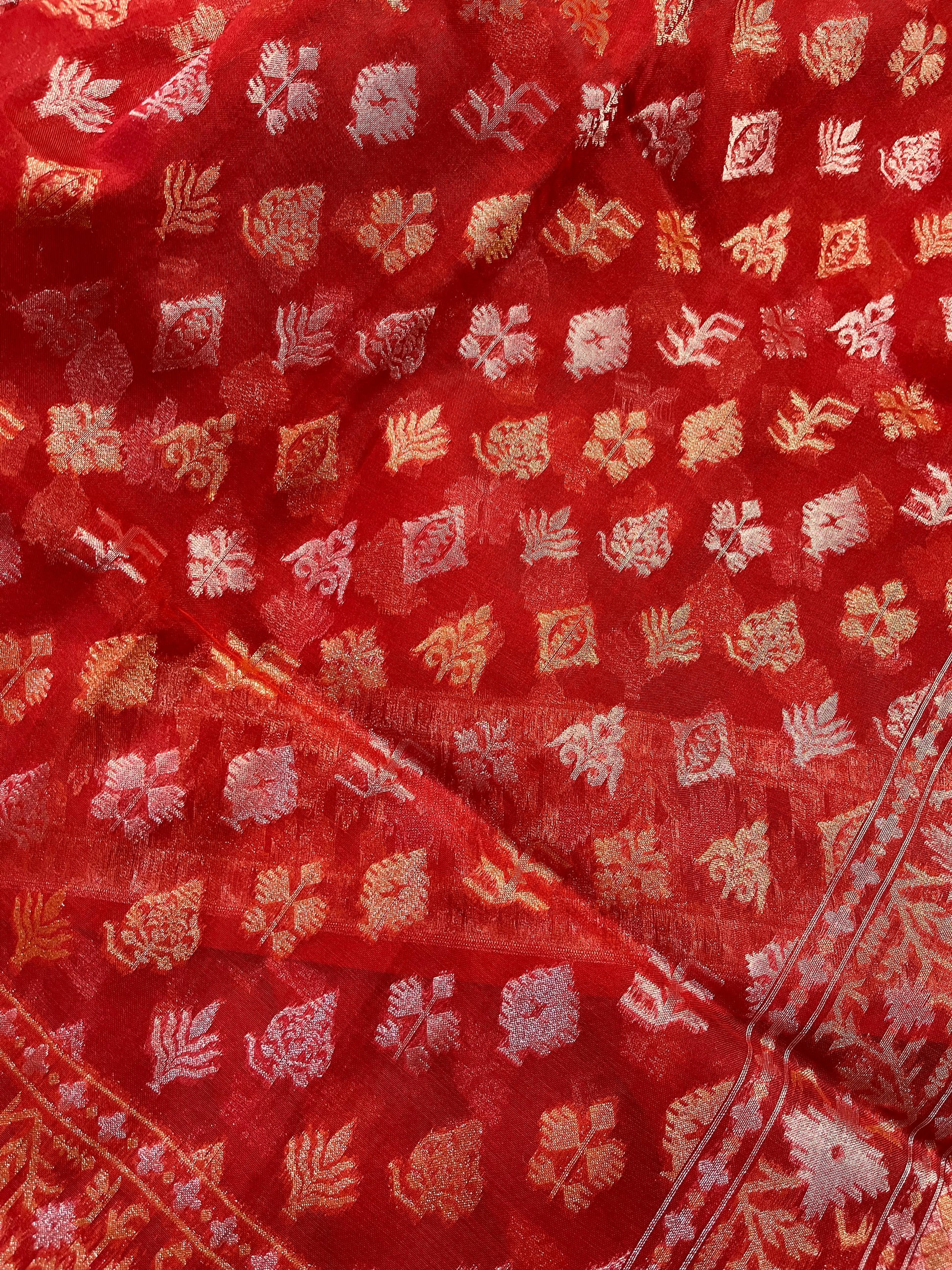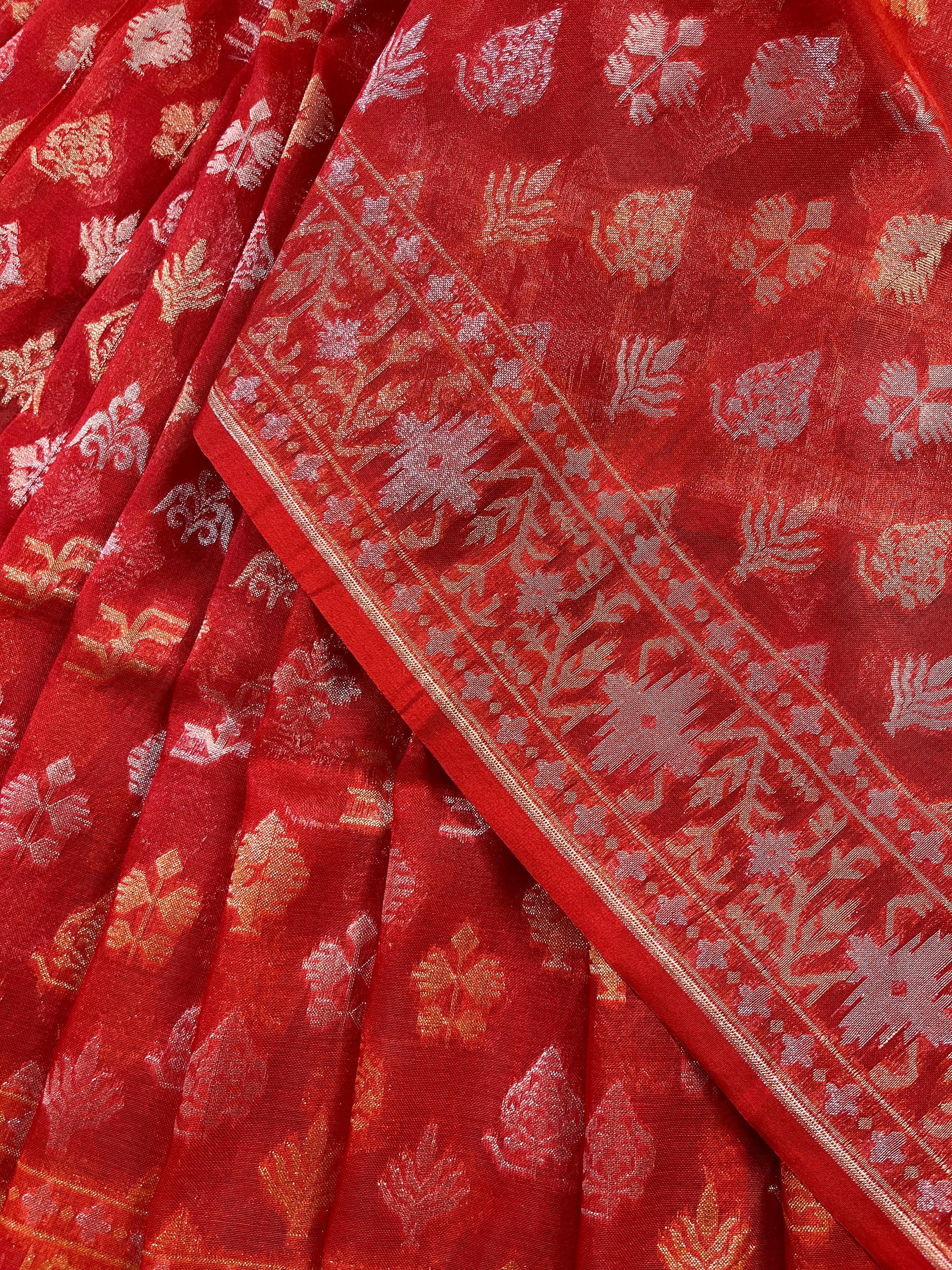Red cotton pure handloom Banarasi saree with all-over silver and gold jamdani weaving, beautifully highlighted with an intricate border and palla. Paired with a matching running blouse piece.