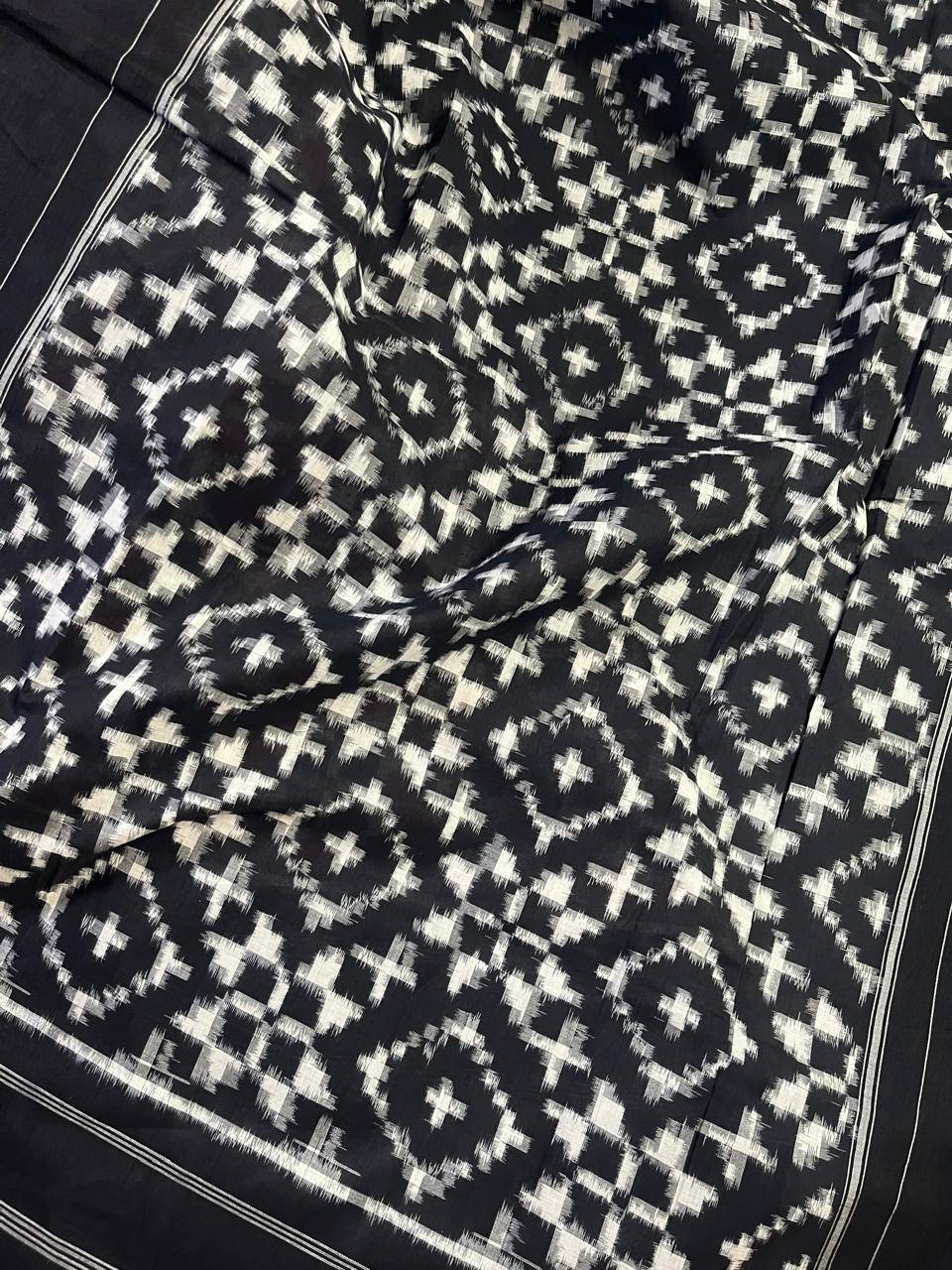 Red cotton pure handloom Ikkat saree A vibrant red cotton pure handloom Ikkat saree adorned with all-over intricate Ikkat weaving, showcasing rich traditional craftsmanship. The saree is framed with a black plain border that adds a bold, striking contrast. Finished with a coordinated Ikkat-woven palla and a matching blouse piece, this drape is perfect for making a statement with timeless elegance.