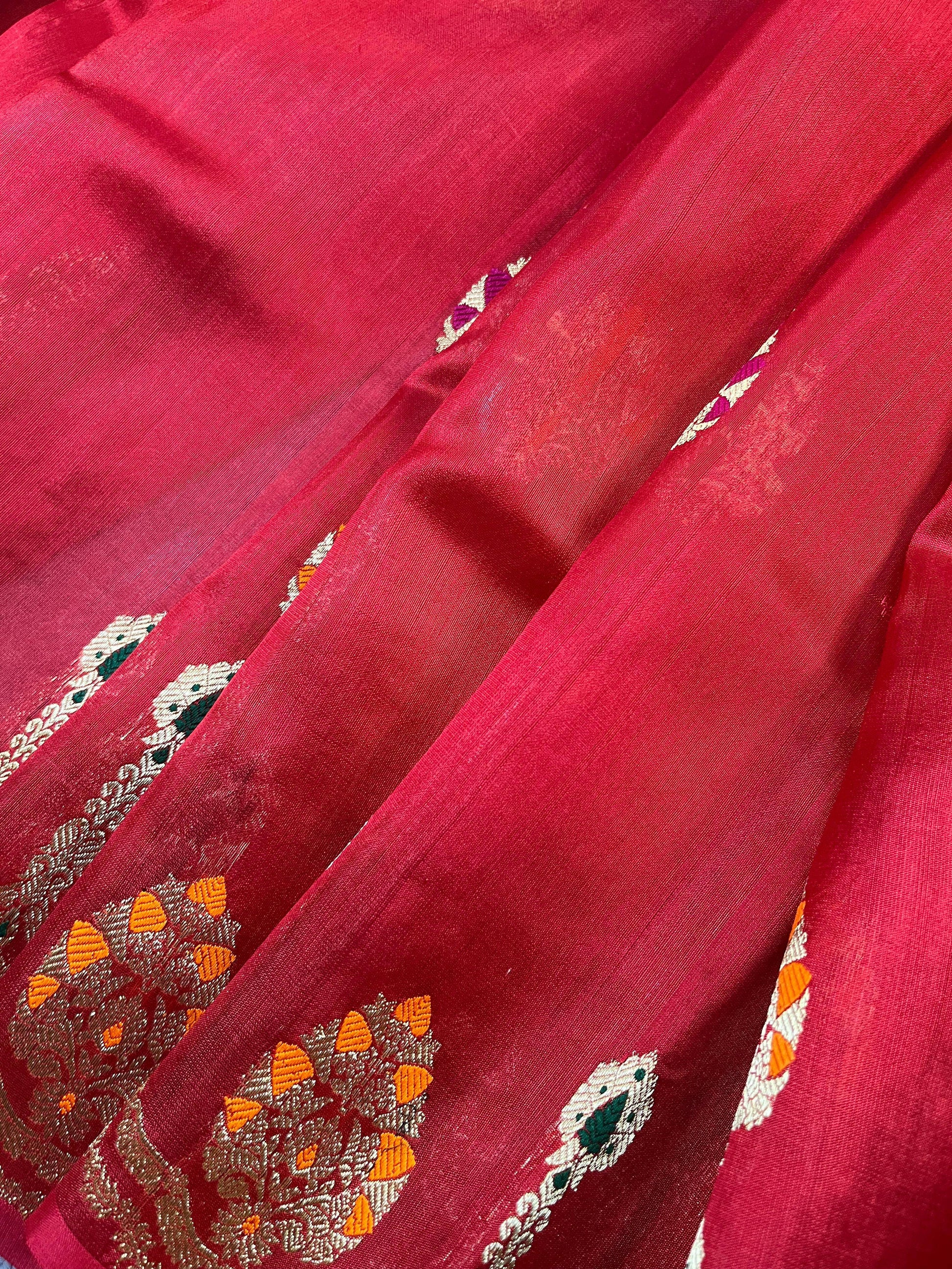 Elegant Red silk pure handloom Chanderi saree adorned with all-over meenakari buttas, featuring an intricately woven meenakari border and a rich brocade palla. Comes with a matching running blouse piece.