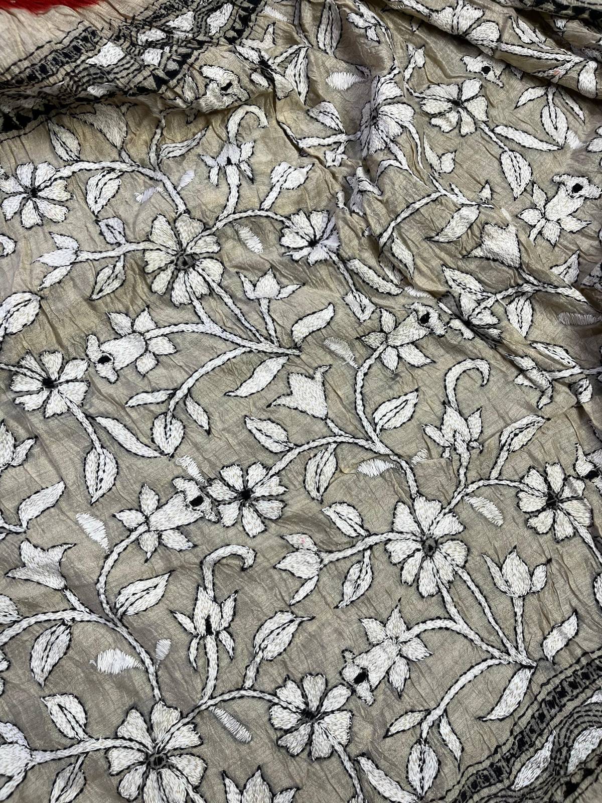Immerse in the elegance of this red tussar pure handloom Bandhej saree, adorned with intricate all-over Bandhej weaving that reflects fine traditional craftsmanship. Its delicate Kantha-woven border and palla add a touch of artistic heritage, enhancing the saree’s refined charm. Paired with a matching running blouse piece, this drape is a statement blend of texture, artistry, and timeless grace—perfect for festive and special occasions.
