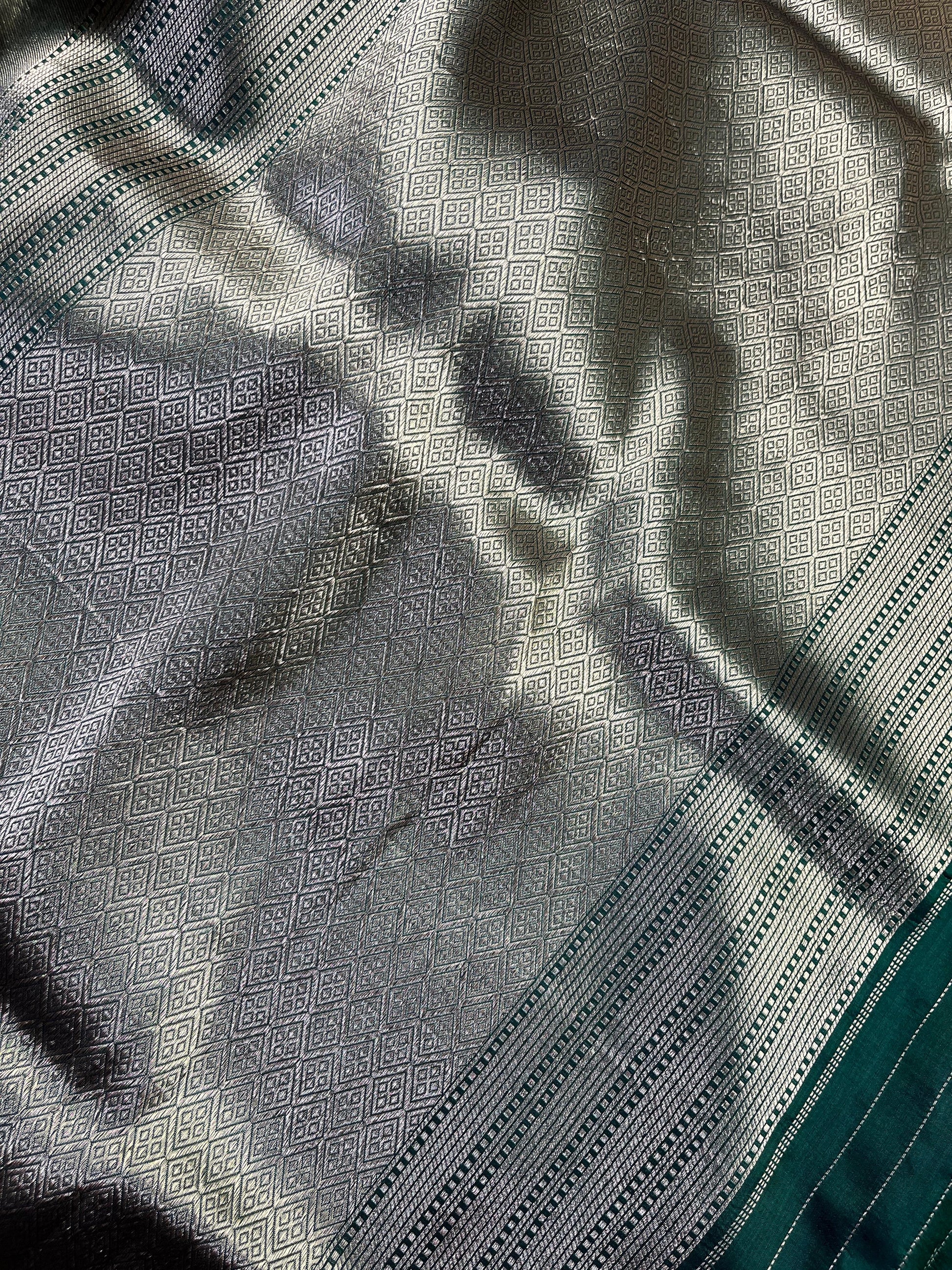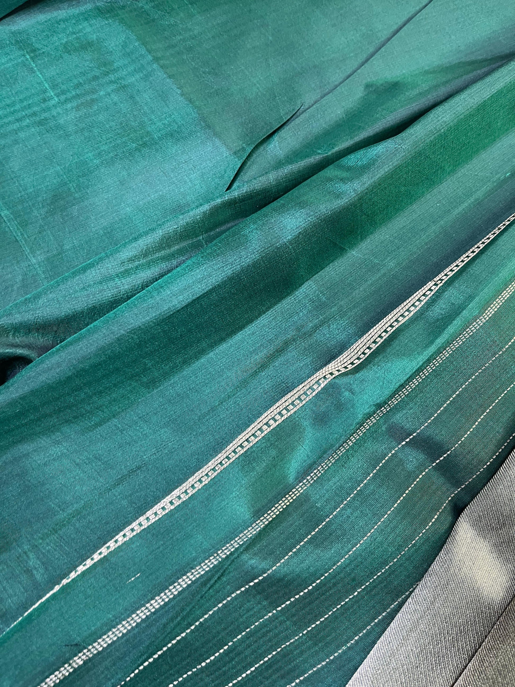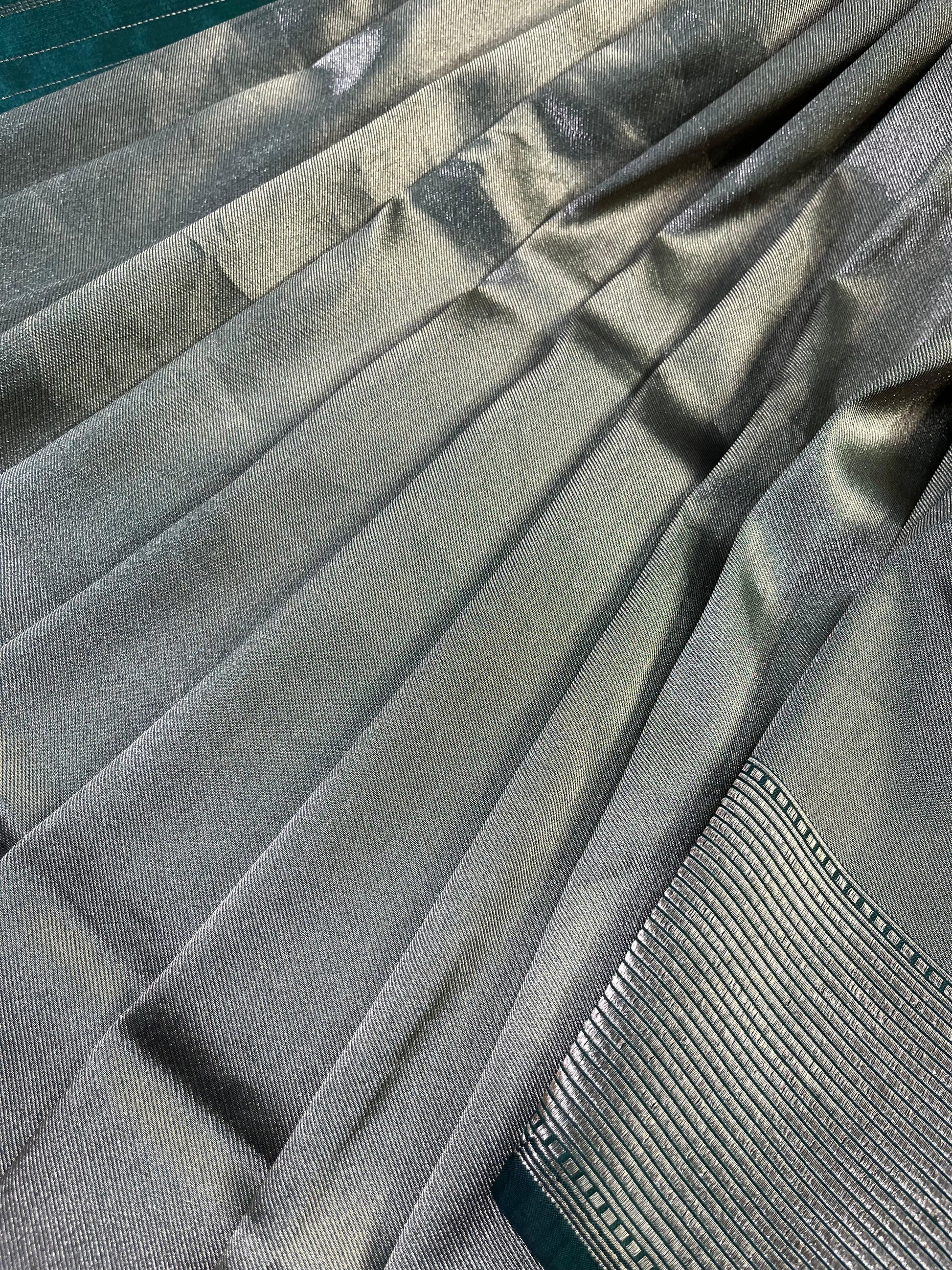 Silver katan tissue pure handloom Banarasi saree featuring a lustrous all-over plain body that exudes subtle sophistication. The saree is adorned with an intricate striped zari border and palla, adding elegant texture and traditional craftsmanship to the drape. Paired with a contrasting green running blouse piece, this saree strikes a perfect balance of heritage charm and contemporary finesse — ideal for weddings, festive celebrations, and grand occasions.