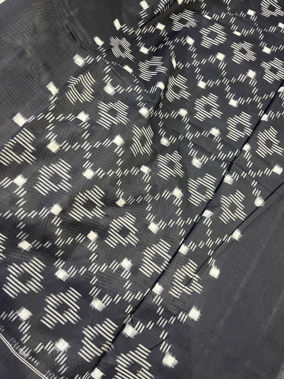 White cotton pure handloom Ikkat saree A classic white cotton pure handloom Ikkat saree featuring all-over intricate Ikkat weaving that brings timeless elegance to the drape. The look is enhanced with a black plain border offering a sharp, sophisticated contrast. Finished with an intricate Ikkat palla and a matching blouse piece, this saree beautifully blends tradition with minimal-chic aesthetics