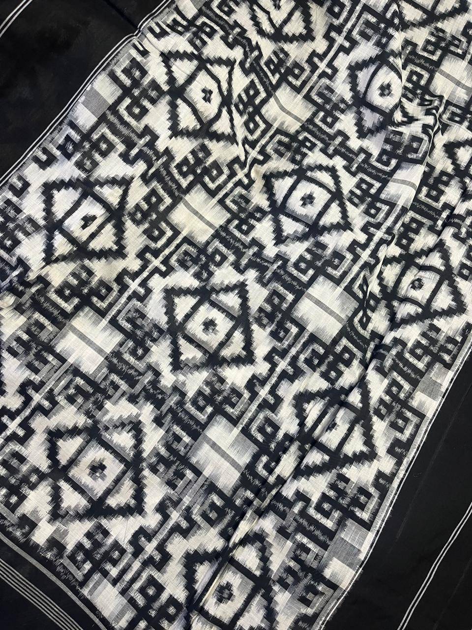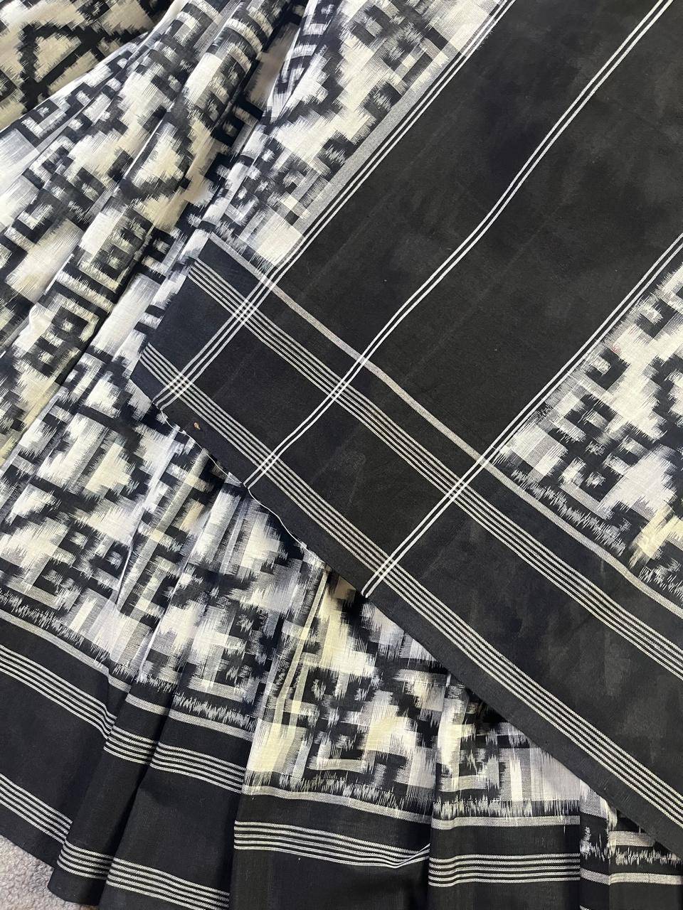 White cotton pure handloom Ikkat saree A timeless white cotton pure handloom Ikkat saree featuring all-over intricate Ikkat weaving that showcases classic craftsmanship. The saree is framed with a black plain border for a bold, elegant contrast. Completed with an intricately woven Ikkat palla and a matching blouse piece, this drape blends minimal elegance with traditional artistry—perfect for everyday sophistication.