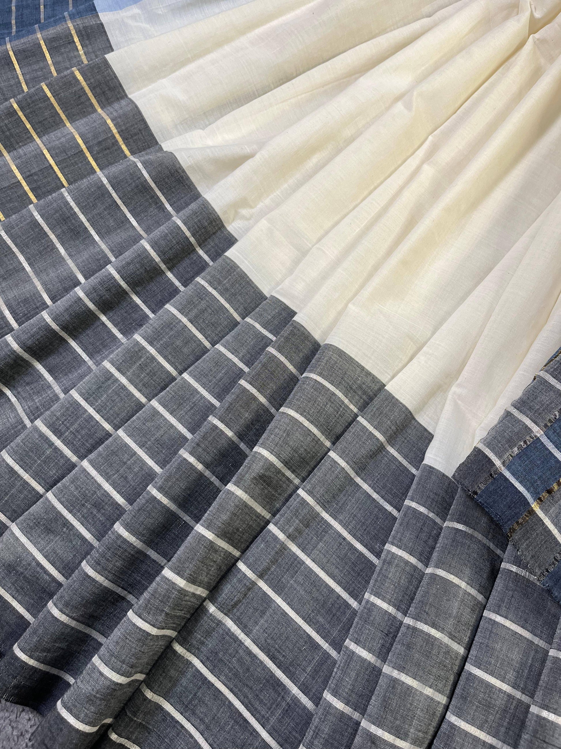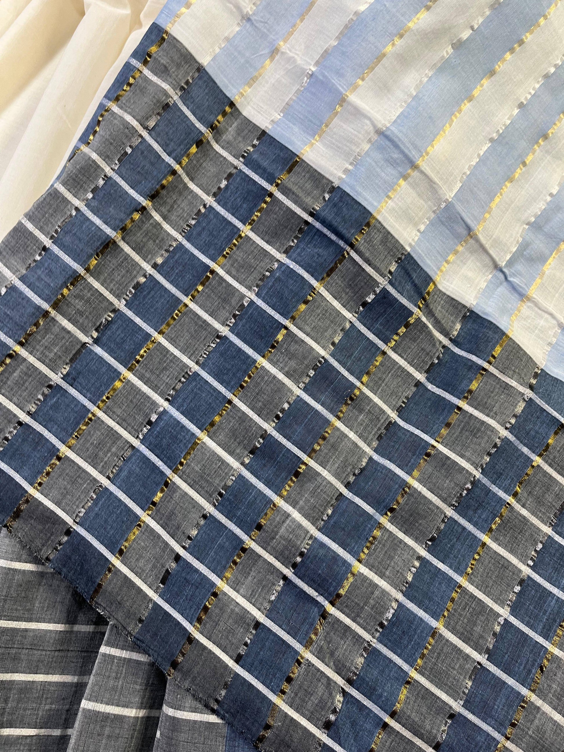 A classic white pure handloom Kerala cotton saree, designed with a unique half-plain and half blue–silver striped body for a contemporary traditional look. The saree is finished with an extended striped palla that adds elegance and comes with a matching running blouse piece. Lightweight, breathable, and timeless, it is perfect for daily wear, festive occasions, and traditional Kerala styling.