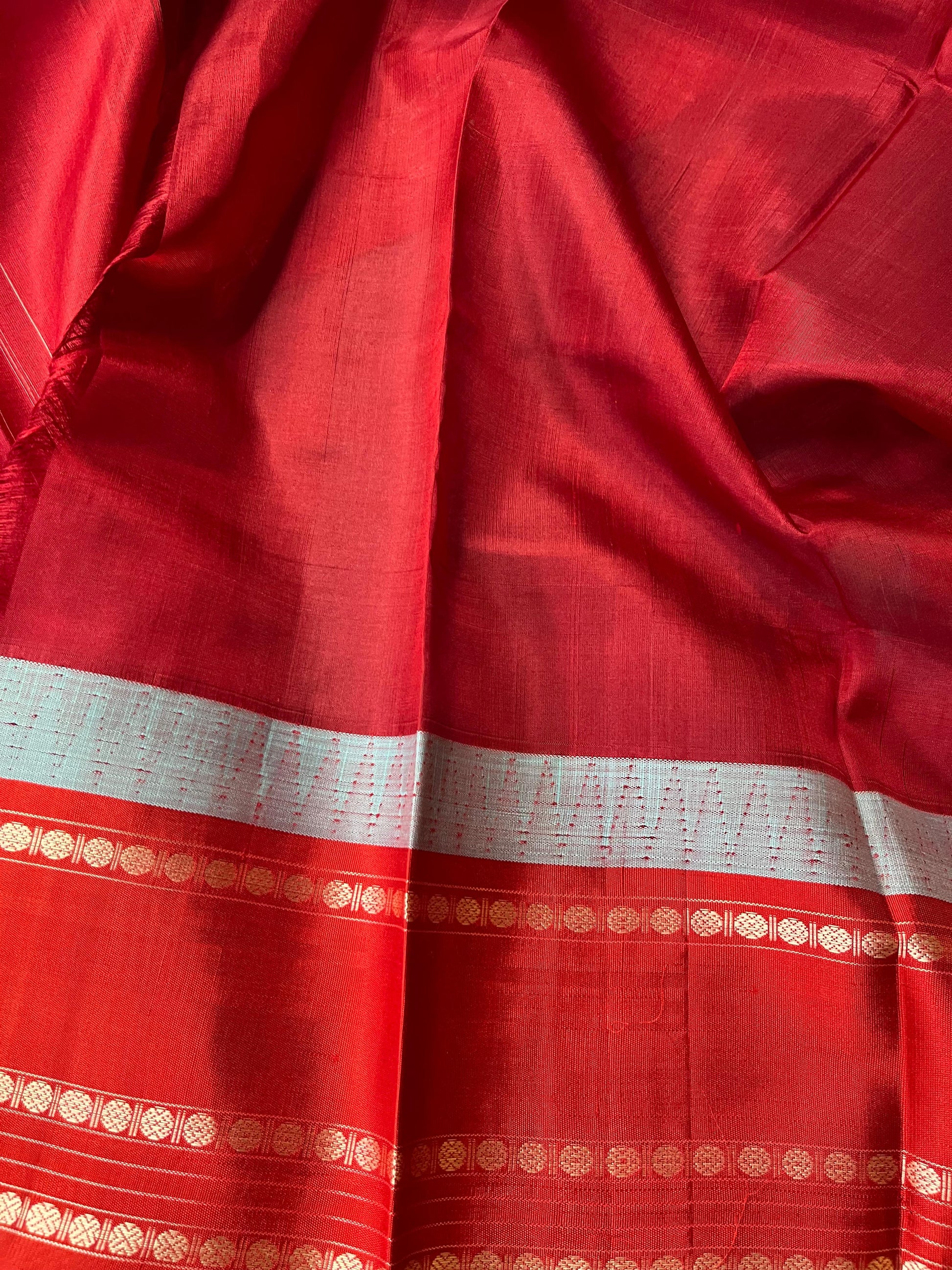 A radiant yellow cotton pure handloom Kanjivaram saree, crafted in classic elegance, featuring an all-over plain body highlighted with a rich red silk border and palla. Paired with a matching red running blouse piece, this drape beautifully blends tradition with minimal sophistication—perfect for festive and cultural occasions.