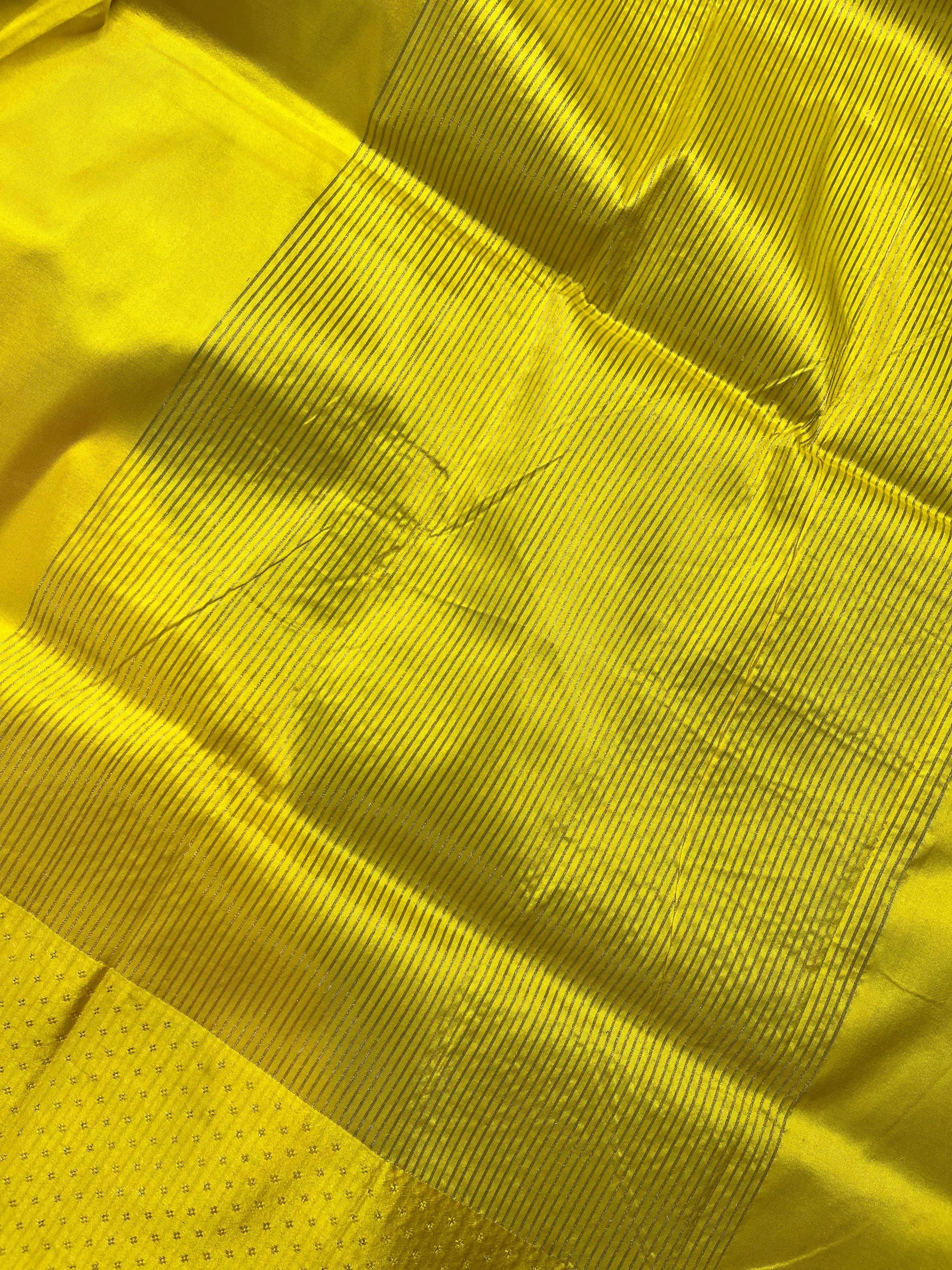 Bright and graceful, this pure handloom Banarasi saree is woven in radiant yellow mushroo silk, offering a rich texture and elegant fall. The saree features a plain body that beautifully highlights the intricately crafted Tanchoi border and the palla adorned with delicate zari stripes, showcasing refined Banarasi weaving techniques. Finished with a contrasting purple running blouse piece, this saree is perfect for festive occasions, weddings, and traditional celebrations.